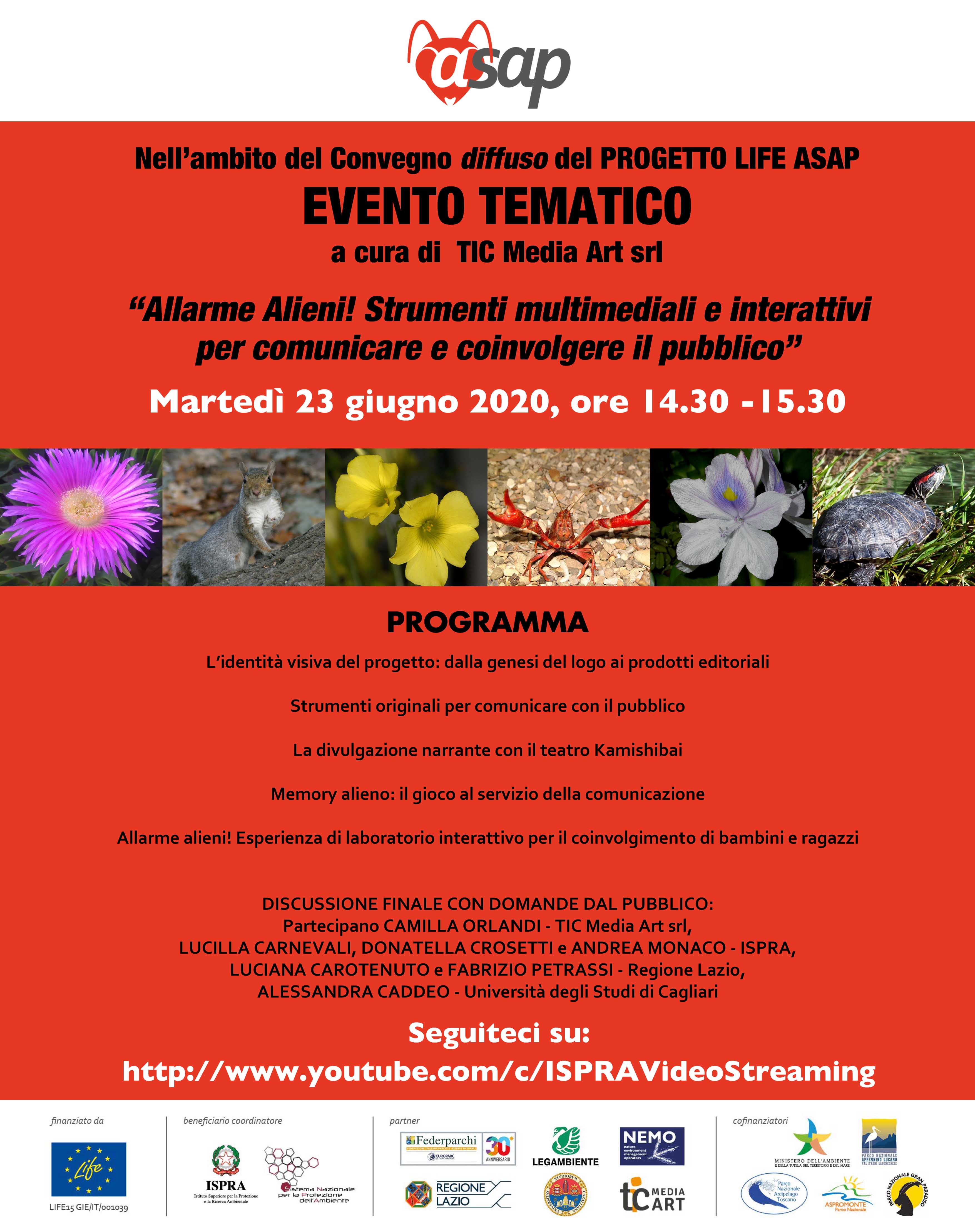 Starting from these premises, Life ASAP - Alien Species Awareness Program was funded, a project coordinated by ISPRA, which involves Lazio Region, University of Cagliari, Federparchi, Legambiente, Nemo srl, TIC srl as partners, and which has been co-financed, in addition that from the European Union, also from the Ministry of the Environment and the National Parks of Aspromonte, Appennino Lucano, Tuscan Archipelago and Gran Paradiso.The final results of the project will be presented as part of a conference to be held on 23, 24 and 25 June, organized in a main digital event and following 5 thematic online events.