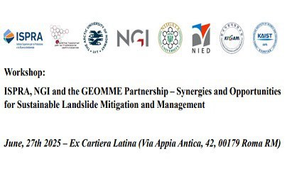 - A Workshop co-organized by ISPRA and NGI ( Norwegian Geotechnical Institute ) on sustainable landslide risk mitigation and management will be held on June 27th at the Ex Cartiera Latina (Rome). The event will feature speakers from prestigious international universities and research centers such as the University of Florence (Italy), Norwegian Geotechnical Institute (NGI, Norway), Korea Advanced Institute of Science and Technology ( KAIST, South Korea), National Research Institute for Earth Science and Disaster Prevention ( NIED , Japan), Gangneung-Wonju National University ( GWNU , South Korea), Korea Institute of Geoscience and Mineral Resources ( KIGAM , South Korea), as well as a number of ISPRA technologists. ISPRA employees who wish to do so will be able to present posters on activities relevant to the theme of the day. It will be possible to follow in-person and remotely via the link