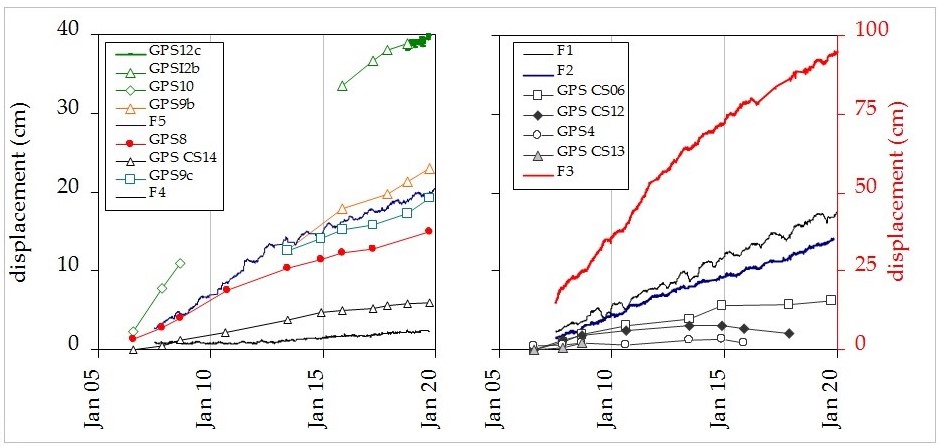 Horizontal displacements detected by all GPS stations over time in the two landslide bodies |