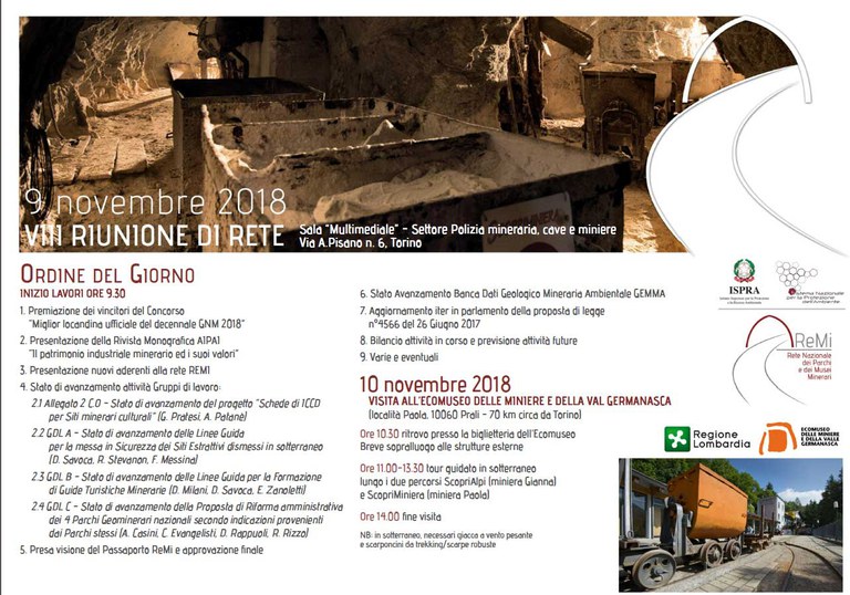 Sarà la Regione Piemonte  questa volta ad ospitare i lavori della Rete Nazionale dei Parchi e Musei Minerari italiani – ReMi. Organizzata da ISPRA-ReMi, in collaborazione con la Regione Piemonte e l’Ecomuseo Regionale delle Miniere e della Val Germanasca,  la VIII riunione ReMi si terrà il giorno 9 novembre dalle ore 09:30.
