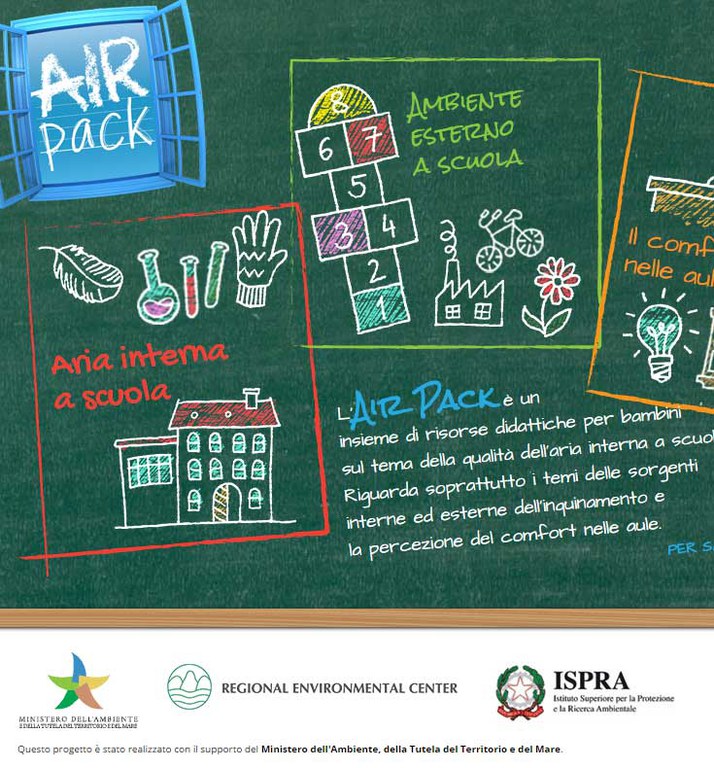 L’AirPack rappresenta un primo toolkit multimediale in Europa nel suo genere, è un kit composto da diverse risorse didattiche rivolte sia agli insegnanti sia agli studenti e affronta i temi dell’inquinamento dell’aria indoor nelle aule e dei giusti comportamenti da attuare per migliorarne la qualità, capire i rischi e imparare a prevenirli. In particolare, il kit offre agli insegnanti schede per preparare lezioni sulla qualità dell’aria nelle scuole, mentre agli alunni sono riservate apposite sezioni, per apprendere giocando attraverso quiz e giochi di memoria. Il target principale sono bambini tra gli 8 e gli 11 anni.Le problematiche affrontate nel toolkit vanno dagli inquinanti chimici e biologici presenti all’interno e all’esterno delle scuole, con un richiamo ai rischi per la salute ad essi associati. Una sessione è inoltre dedicata al microclima e ai principali parametri da considerare e alle azioni da mettere in atto per rendere confortevole l’ambiente scolastico.