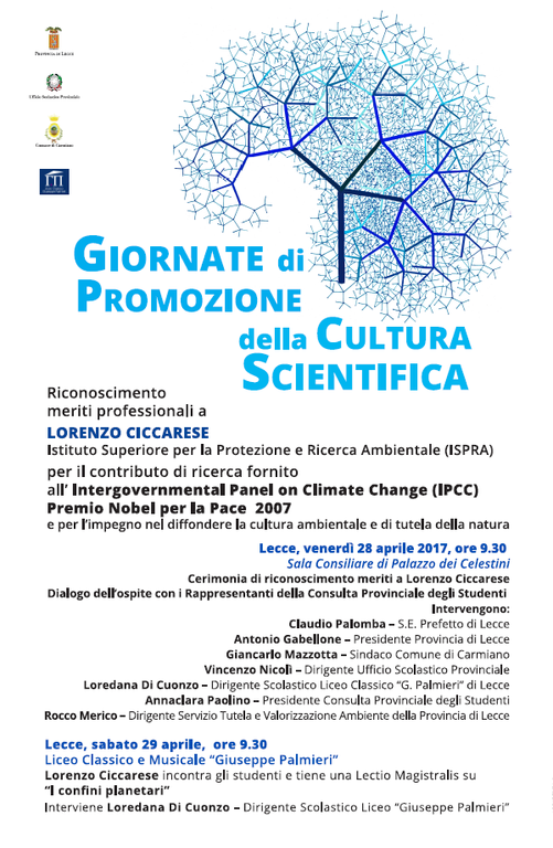 Oggi, 28 Aprile, presso la Sala Consiliare di Palazzo dei Celestini a Lecce, avrà luogo la cerimonia di riconoscimento per meriti scientifici al dr. Lorenzo Ciccarese dell'ISPRA, che con la sua attività di ricerca sui cambiamenti climatici ha contribuito all'assegnazione del riconoscimento dell' Accademia di Stoccolma, nel 2007, all'Intergovernmental Panel on Climate Change. Il ricercatore ISPRA è tra i componenti del Gruppo intergovernativo sul cambiamento climatico (IPCC), premiati nel 2007 con il Nobel per la Pace "per i loro sforzi per costruire e diffondere una conoscenza maggiore sui cambiamenti climatici provocati dall'uomo e per porre le basi per le misure necessarie a contrastare tali cambiamenti". Il premio dell'IPCC, organismo istituito dall'Onu nel 1988, è stato condiviso con l' ex vice presidente degli Stati Uniti Al Gore.