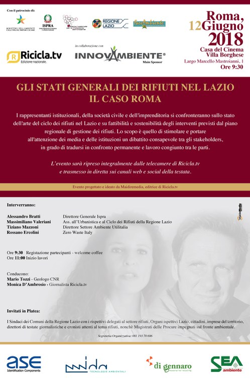 Si è svolto il 12 giugno presso la Casa del Cinema di Villa Borghese a Roma, la tappa laziale dell'evento itinerante ideato da RiciclaTv, la prima web Tv dedicata al mondo dei rifiuti, dal titolo "Gli Stati Generali dei rifiuti nel Lazio - il Caso Roma", durante il quale sono state individuate le criticità e le iniziative per chiudere il ciclo di gestione dei rifiuti urbani soprattutto dopo la chiusura dell'impianto di Malagrotta avvenuto nel 2013. "Raccolta differenziata e compostaggio rappresentano opzioni strategiche ma non sono sufficienti; occorre in una fase di transizione chiudere il ciclo dei rifiuti utilizzando impianti di smaltimento" così ha dichiarato il Direttore Generale dell'ISPRA, Alessandro Bratti, intervenuto all'incontro.