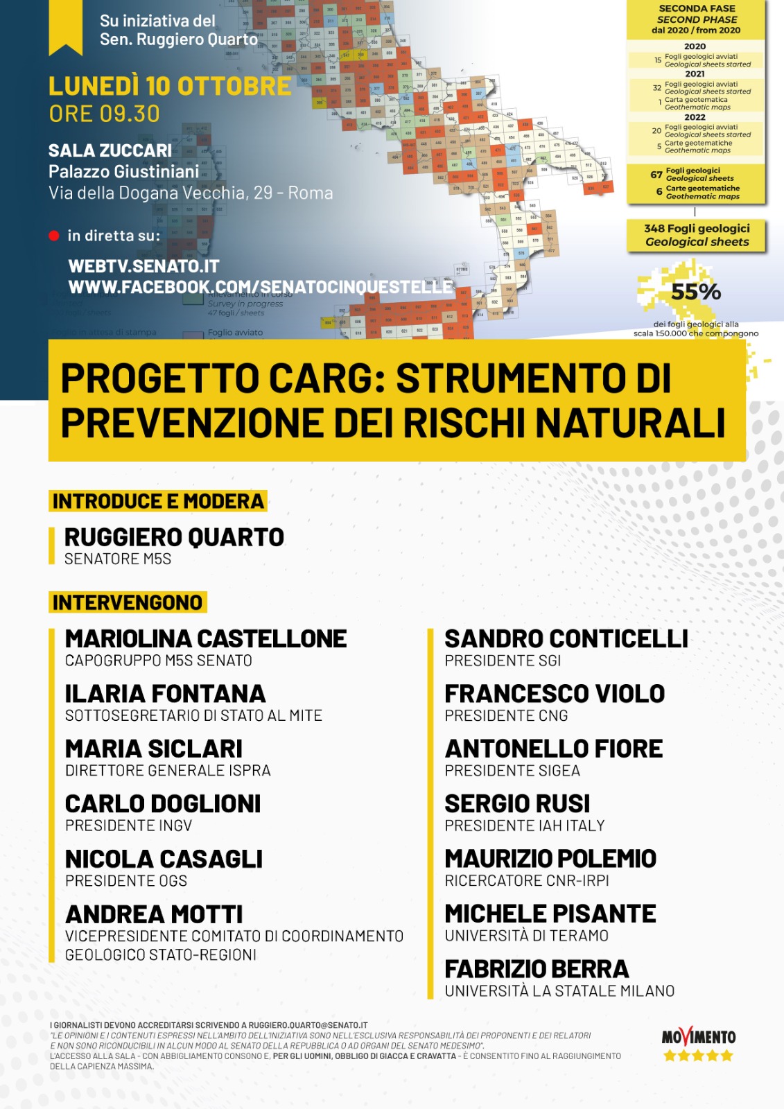 - Scopo dell’evento è evidenziare l'importanza del Progetto CARG poiché rappresenta una sofisticata infrastruttura di ricerca, di fatto strategica per l’Italia, in particolare per perseguire lo sviluppo ecosostenibile e la pianificazione consapevole del territorio, per la mitigazione, riduzione e prevenzione dei rischi naturali (sismici, idrogeologici, vulcanici e geochimici), per la tutela dell’ambiente e per la gestione delle georisorse, a partire dalle quelle idriche.