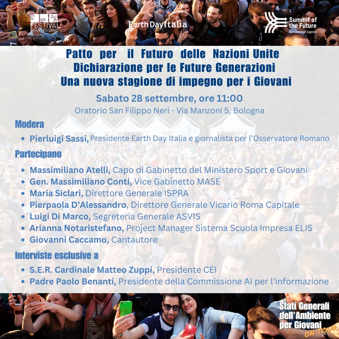 - Sabato 28 settembre nuova tappa del tour di Earth Day Italia che porterà il Patto per il Futuro delle Nazioni Unite nelle citta italiane per rendere i giovani protagonisti dello sviluppo sostenibile. Durante il Festival Francescano di Bologna si è svolto l'evento "Patto per il Futuro delle United Nations. All'incontro ha partecipato il Direttore generale ISPRA, Maria Siclari. Programma