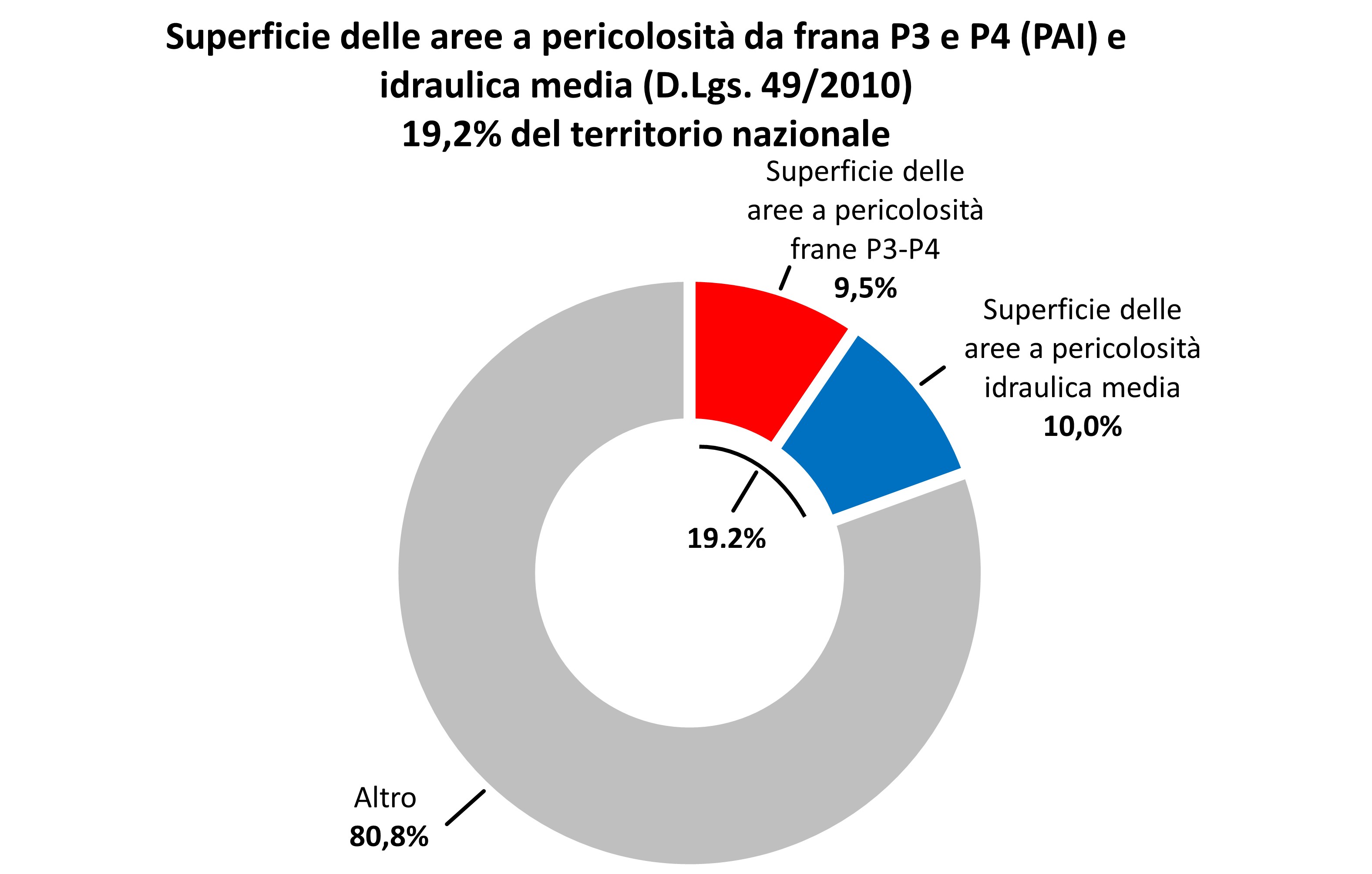 In termini di superficie, le aree classificate a pericolosità da frana elevata e molto elevata (P3-P4) o a pericolosità idraulica media rappresentano il 19,2% del territorio nazionale (57.924 km2) (Dissesto idrogeologico in Italia: pericolosità e indicatori di rischio. Edizione 2024. ISPRA, Rapporti 415/2024).