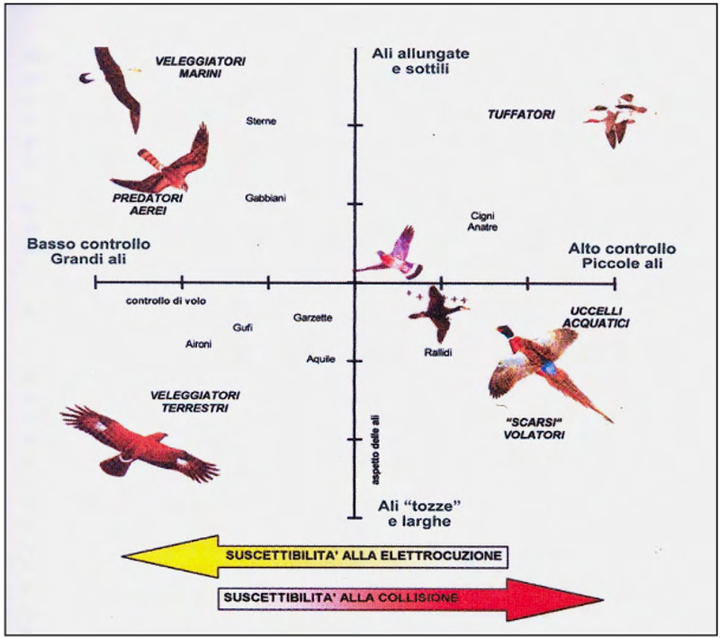 Fig.2. Morfologia delle ali e modalità di volo rendono alcune specie più suscettibili all'elettrocuzione o alla collisione  "tratto da Santolini 2007”)