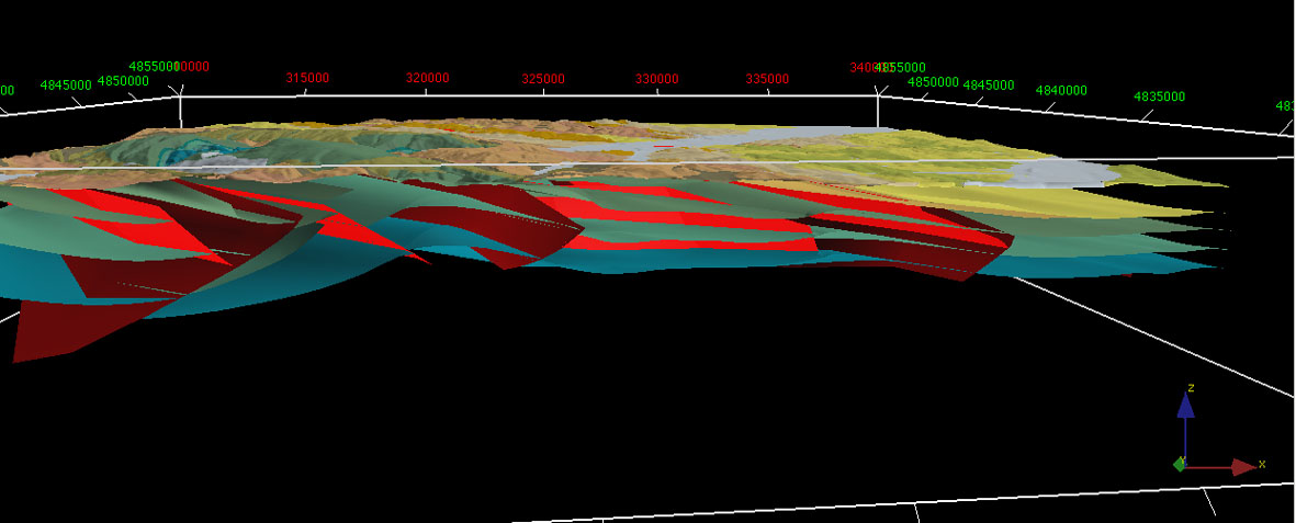 Il modello ricostruito rappresenta in superficie tutte le unità cartografate nel foglio geologico 280 Fossombrone e in sottosuolo le superficie corrispondenti a riflettori sismici ben riconoscibili nelle linee sismiche messe a disposizione da Eni – AGIP e i principali elementi strutturali; la profondità raggiunta è di 3500 metri.