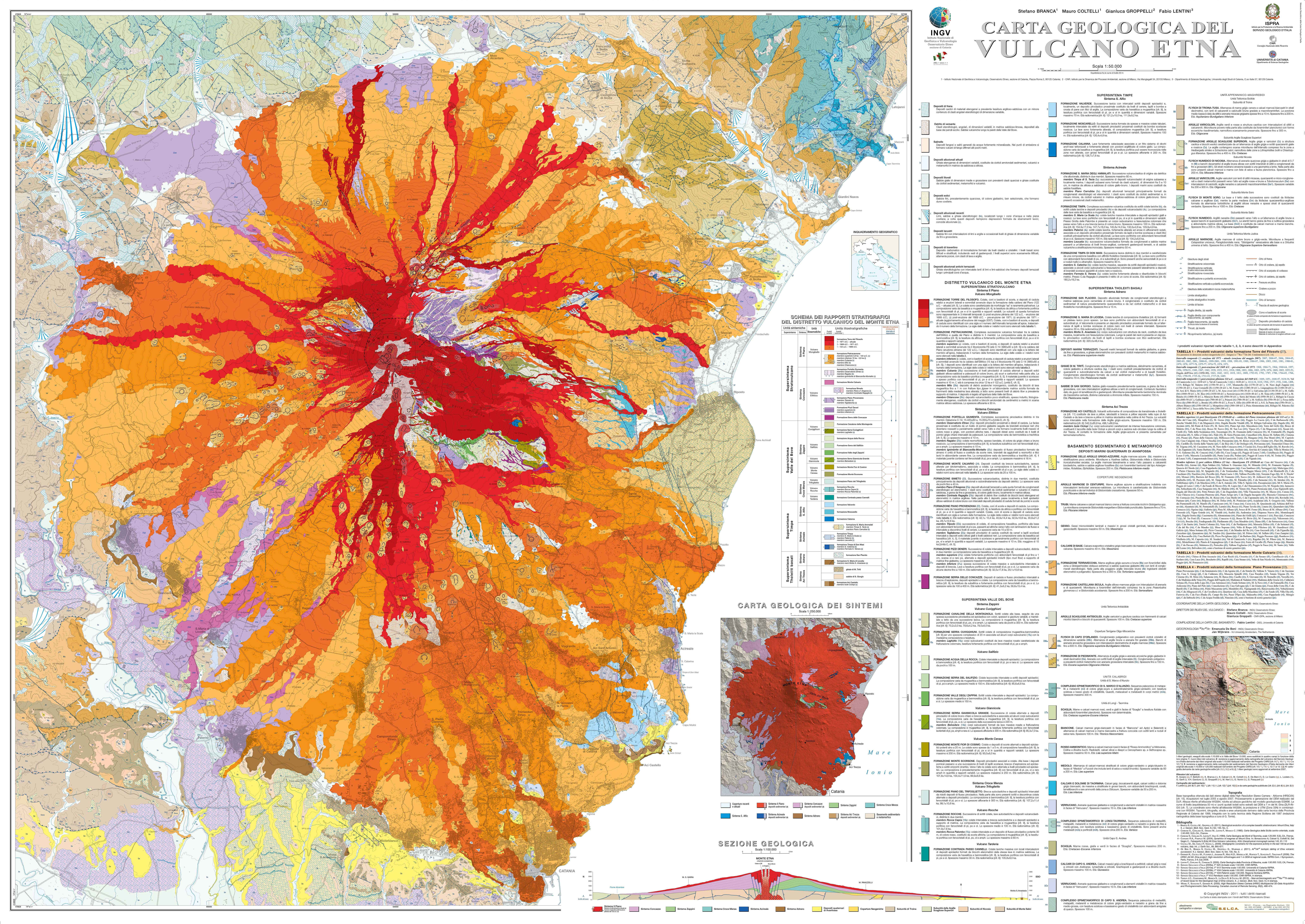 Il Monte Etna, uno dei vulcani più attivi del mondo, è ubicato in corrispondenza della costa orientale della Sicilia in una delle aree più densamente popolate del bacino del Mediterraneo. Un vulcano attivo, come l’Etna, costituisce un potenziale rischio per la comunità che vi risiede a causa delle sue possibili eruzioni laterali distruttive per il tessuto urbano, la cui stima ed eventuale previsione sono ampiamente basate sull’archivio delle passate eruzioni. I rilievi e i dati di campagna, la loro analisi e le relative interpretazioni forniscono utili informazioni riguardo alla frequenza, alla magnitudo, alla distribuzione e allo stile dei fenomeni vulcanici che hanno generato le forme e i depositi distribuiti sul territorio vulcanico. La carta geologica rappresenta uno straordinario archivio di dati concernenti le passate eruzioni e può essere usata per scopi pratici come, per esempio, la gestione del territorio e la sua prevenzione dall’impatto dei fenomeni eruttivi al fine di minimizzare l’esposizione dei beni materiali ai danneggiamenti causati dalle eruzioni, specie quelle più catastrofiche, e quindi essere utile anche alla gestione delle emergenze vulcaniche. Nell’ultimo decennio l’Etna è divenuto uno dei vulcani meglio monitorati e studiati del mondo ed è considerato un laboratorio naturale per vulcanologi e geofisici. In questo volume viene presentata la traduzione in italiano della nuova carta geologica del vulcano Etna alla scala 1:50.000, pubblicata nel 2011 dalla rivista scientifica Italian Journal of Geosciences, accompagnata da datazioni isotopiche 40Ar/39Ar delle unità vulcaniche mappate, dalla ricostruzione dell’evoluzione geologica del complesso vulcanico etneo e dalle datazioni archeomagnetiche e 226Ra-230Th delle colate storiche. La Memoria è organizzata in capitoli scritti da diversi Autori con lo scopo di illustrare la nuova carta geologica del vulcano Etna attraverso la descrizione dei dati raccolti e delle metodologie utilizzate, evidenziando i principali progressi e le novità presenti in questa carta geologica rispetto a quelle pubblicate in precedenza.