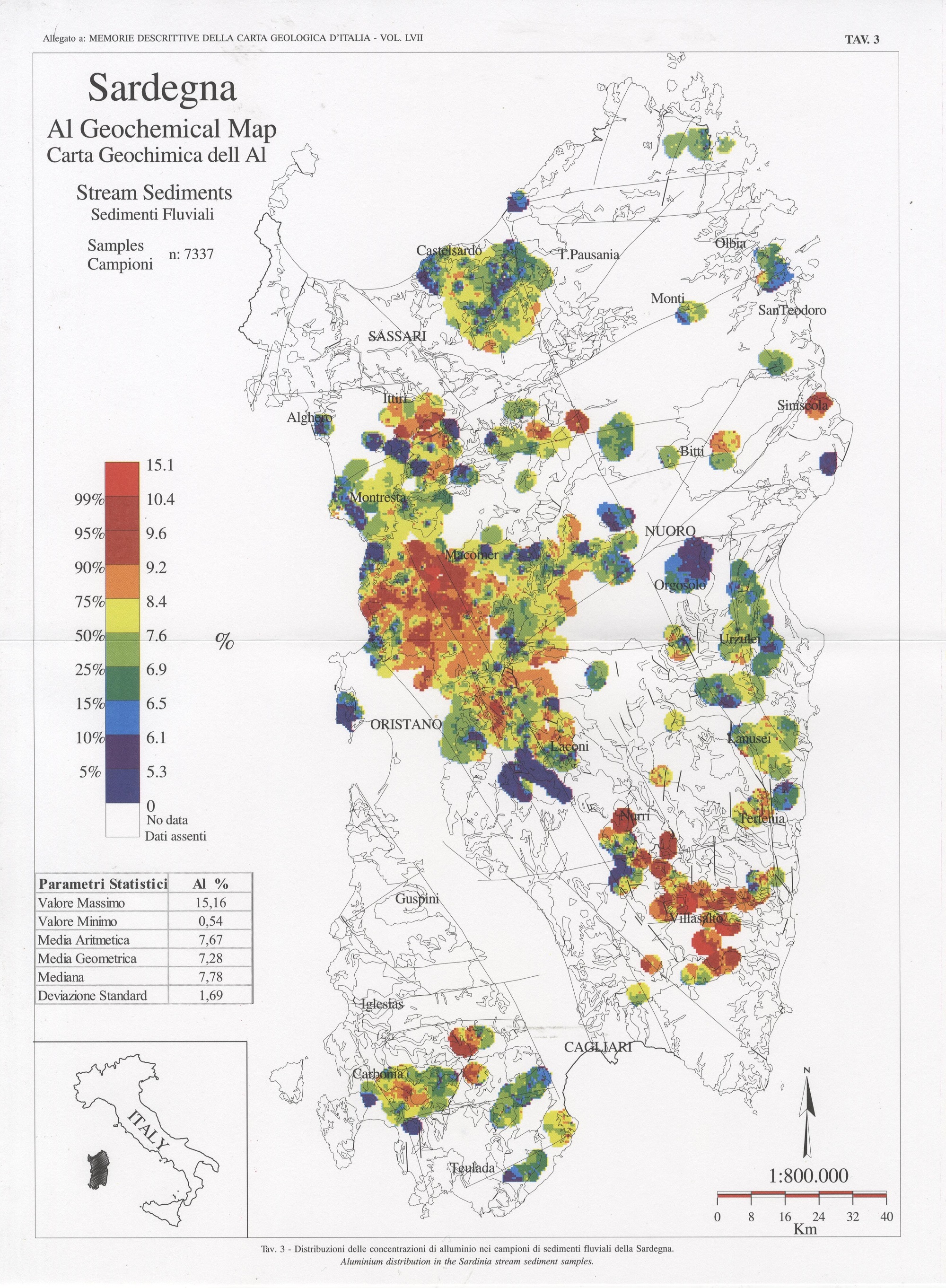 Tav. 3 - Distribuzione delle concentrazioni di alluminio nei campioni di sedimenti fluviali della Sardegna