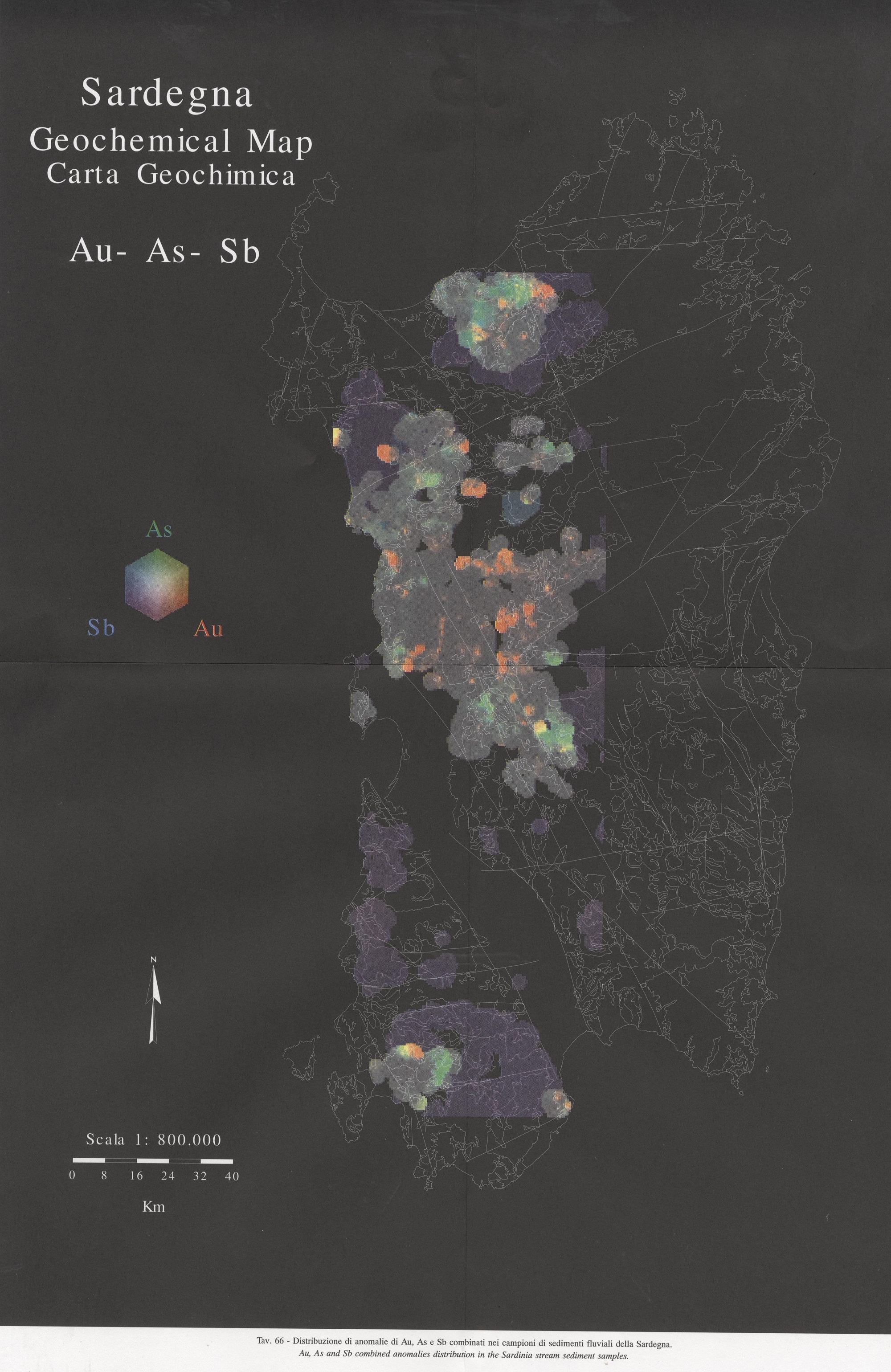 Tav. 66 - Distribuzione di anomalie di Au, As e Sb combinati nei campioni di sedimenti fluviali della Sardegna