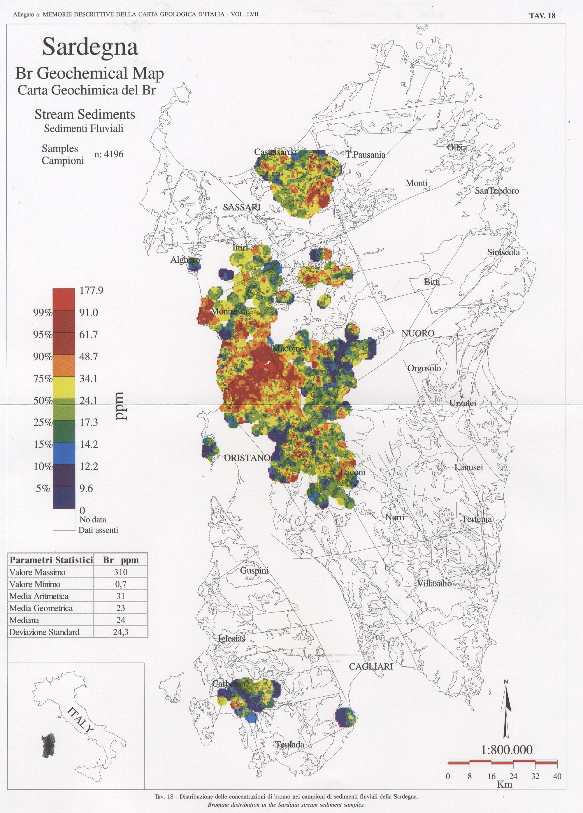 Tav. 18 - Distribuzione delle concentrazioni di bromo nei campioni di sedimenti fluviali della Sardegna