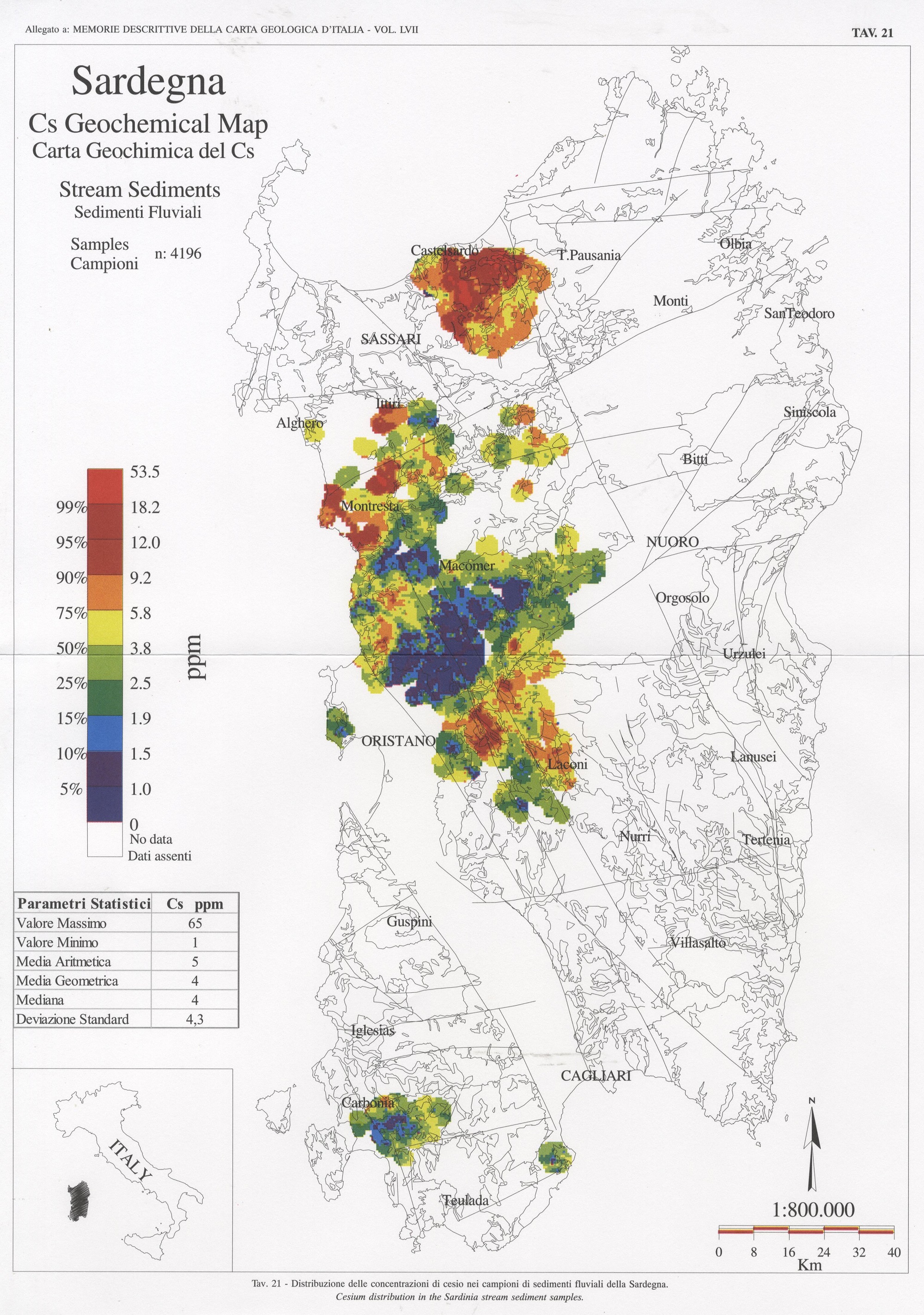 Tav. 21 - Distribuzione delle concentrazioni di cesio nei campioni di sedimenti fluviali della Sardegna