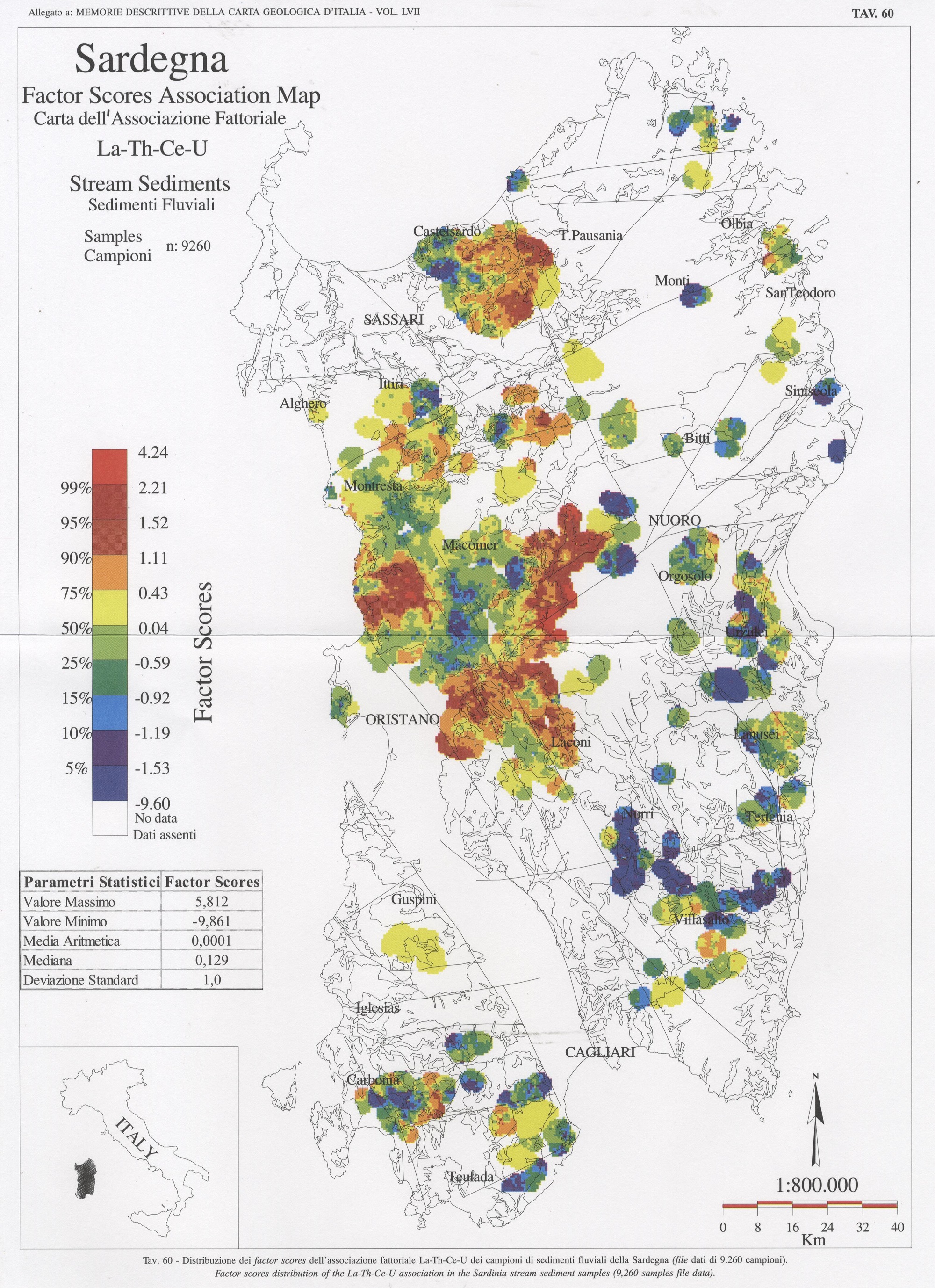 Tav. 60 - Distribuzione dei factor scores dell'associazione fattoriale La-Th-Ce-U dei campioni di sedimenti fluviali della Sardegna (file dati di 9.260 campioni)