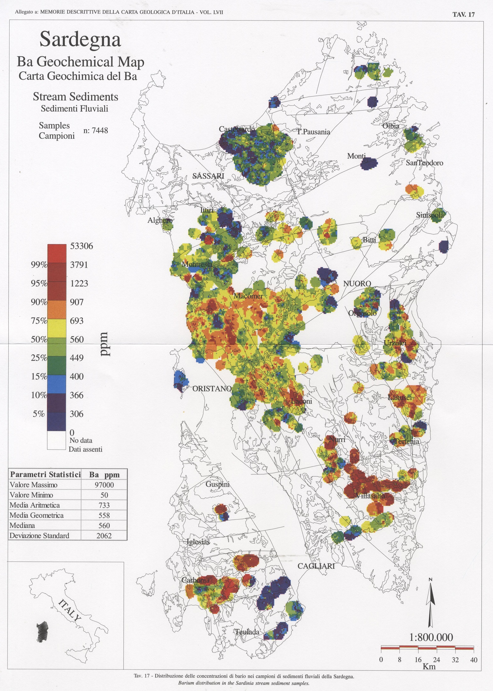 Tav. 17 - Distribuzione delle concentrazioni di bario nei campioni di sedimenti fluviali della Sardegna