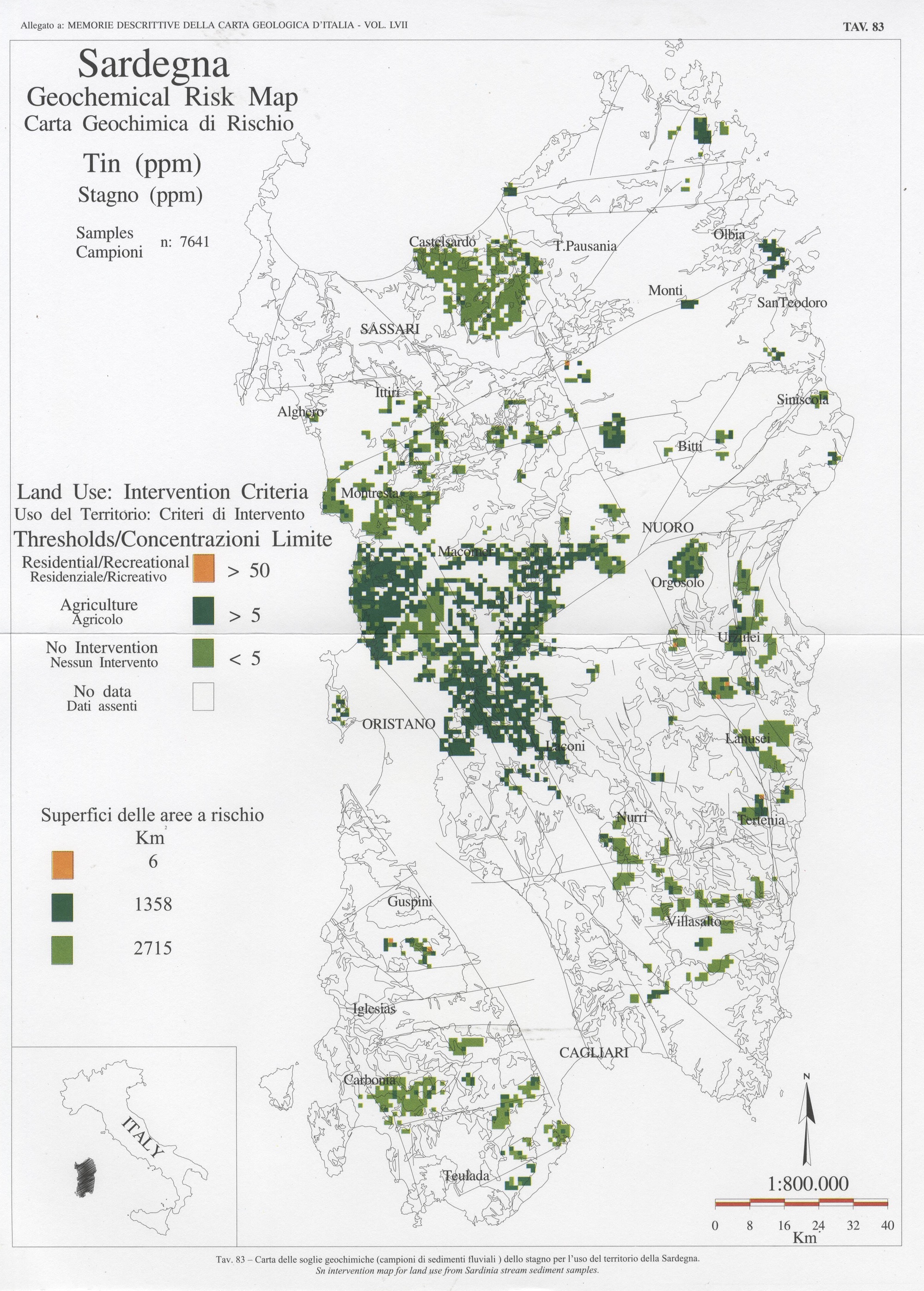 Tav. 83- Carta delle soglie geochimiche (campioni di sedimenti fluviali) dello stagno per l'uso del territorio della Sardegna