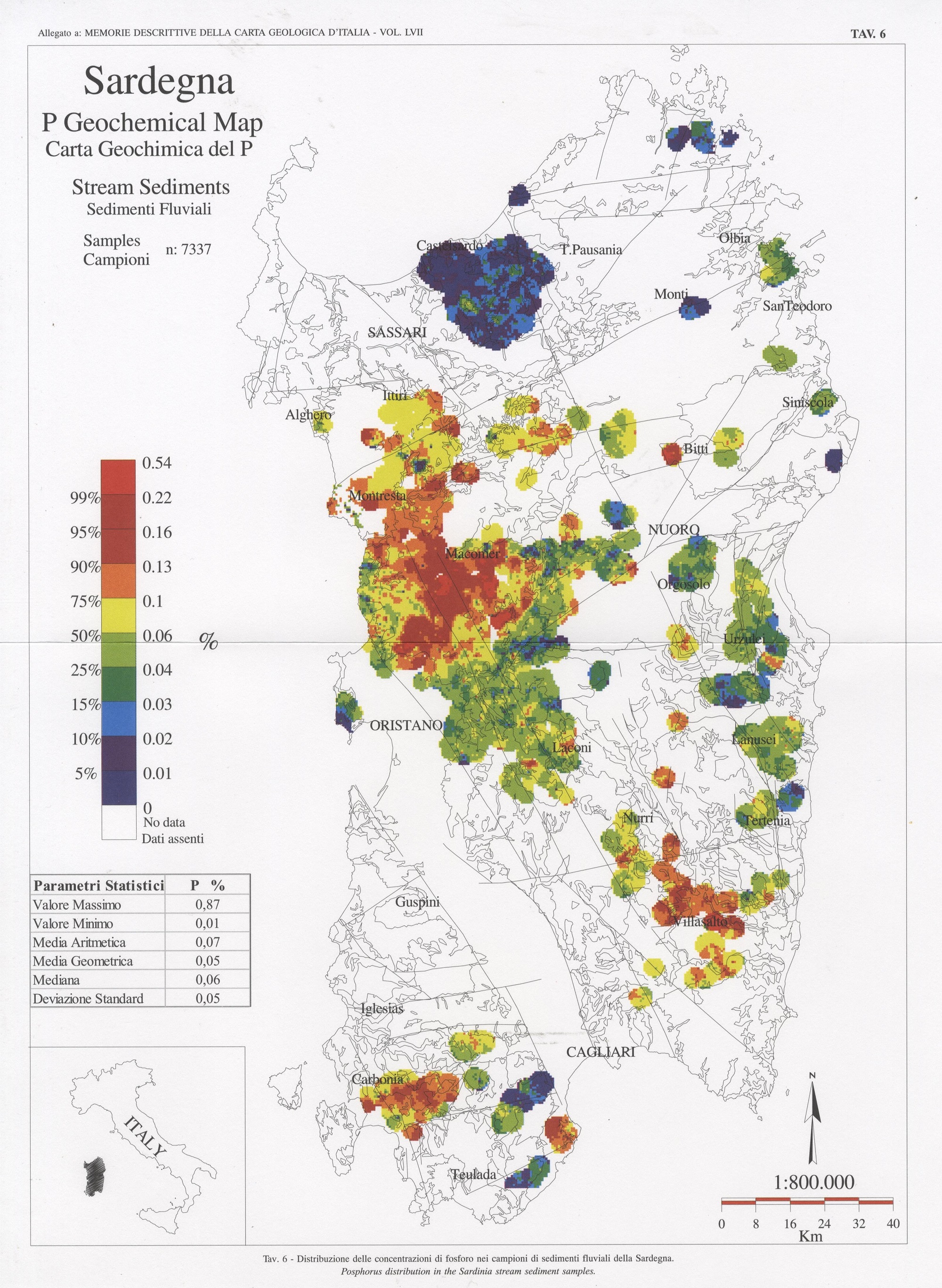 Tav. 6 - Distribuzione delle concentrazioni di fosforo nei campioni di sedimenti fluviali della Sardegna