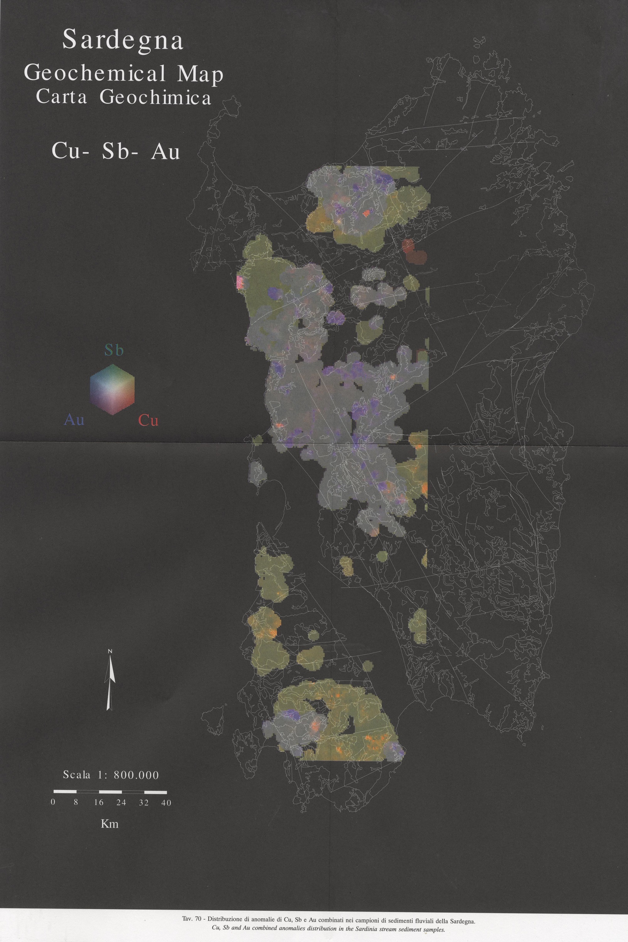Tav. 70 - Distribuzione di anomalie di Cu, Sb n e Au combinati nei campioni di sedimenti fluviali della Sardegna