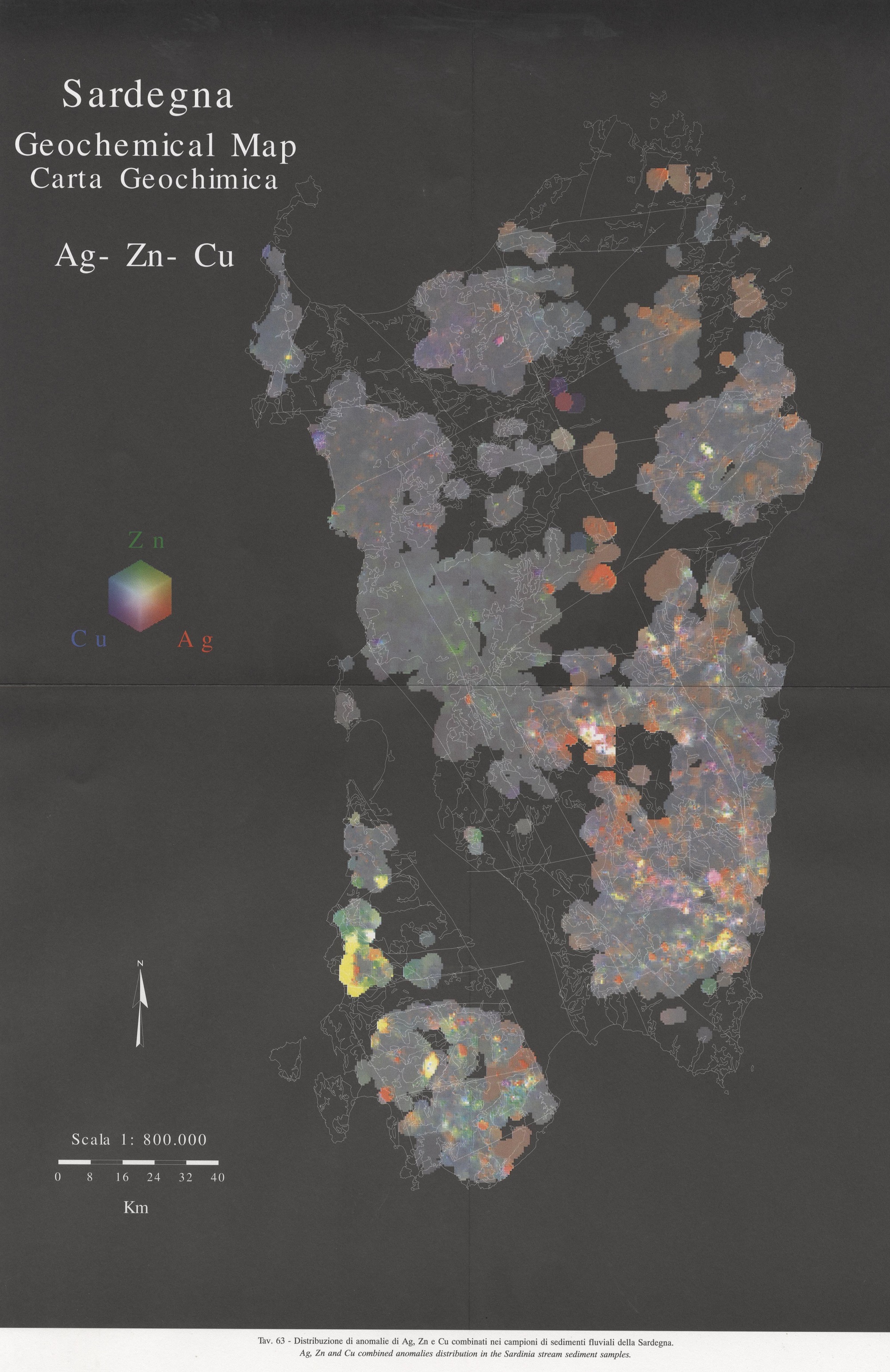 Tav. 63 - Distribuzione di anomalie di Ag, Zn e Cu combinati nei campioni di sedimenti fluviali della Sardegna