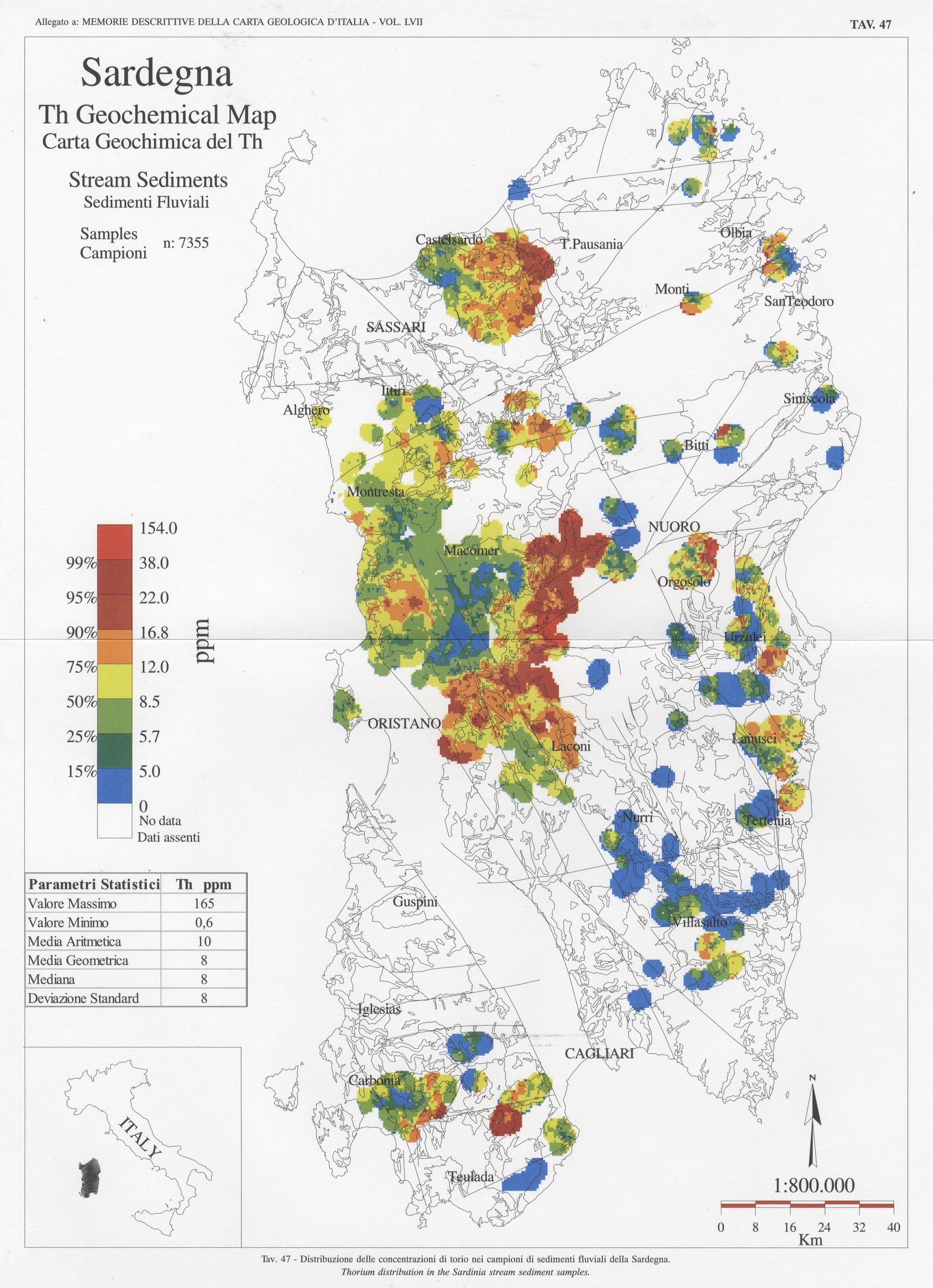 Tav. 47 - Distribuzione delle concentrazioni di torio nei campioni di sedimenti fluviali della Sardegna