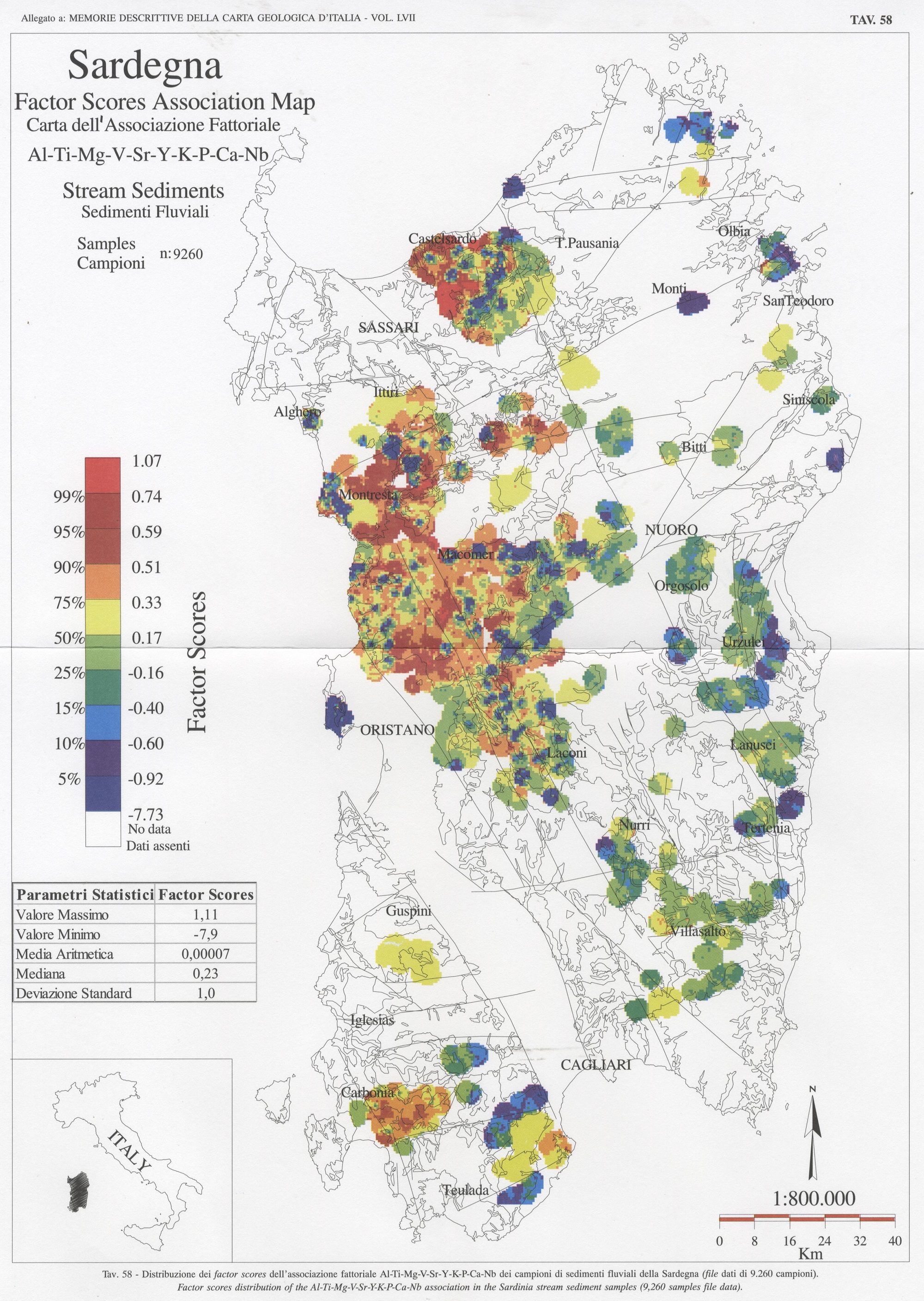 Tav. 58 - Distribuzione dei factor scores dell'associazione fattoriale Al-Ti-Mg-V-Sr-Y-K-P-Ca-Nb dei campioni di sedimenti fluviali della Sardegna (file dati di 9.260 campioni)