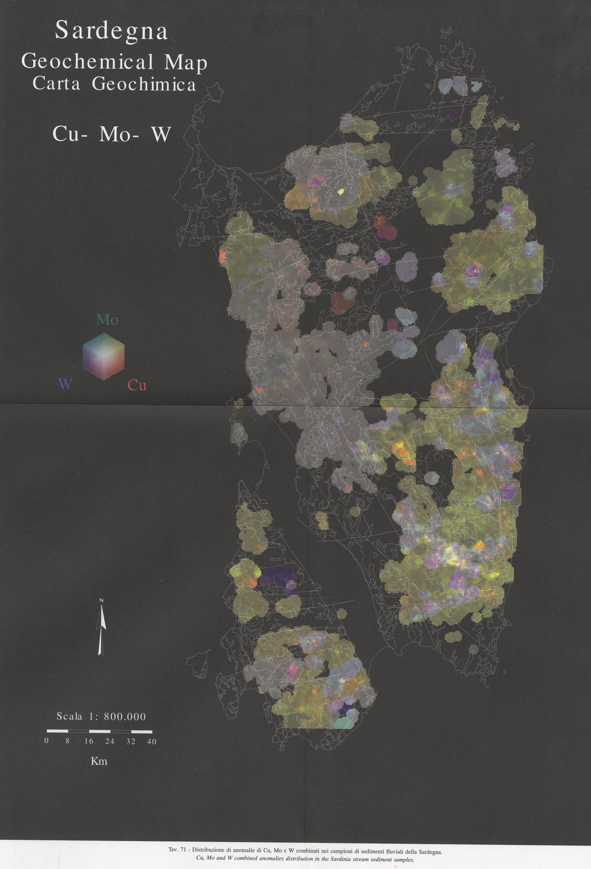 Tav. 71 - Distribuzione di anomalie di Cu, Mo e W combinati nei campioni di sedimenti fluviali della Sardegna