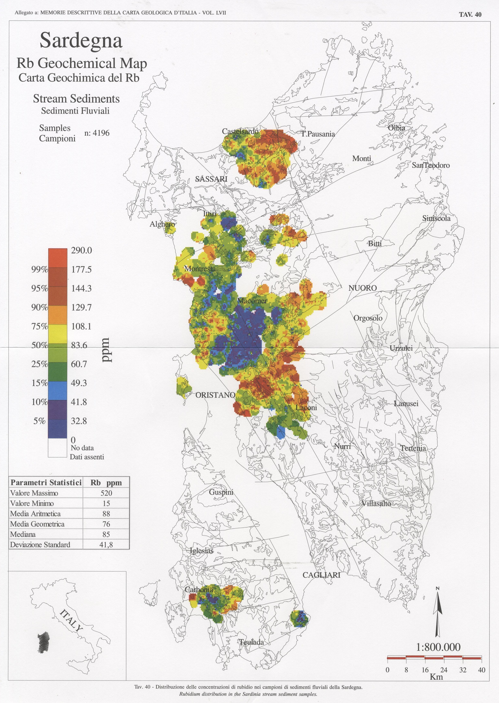 Tav. 40 - Distribuzione delle concentrazioni di rubidio nei campioni di sedimenti fluviali della Sardegna