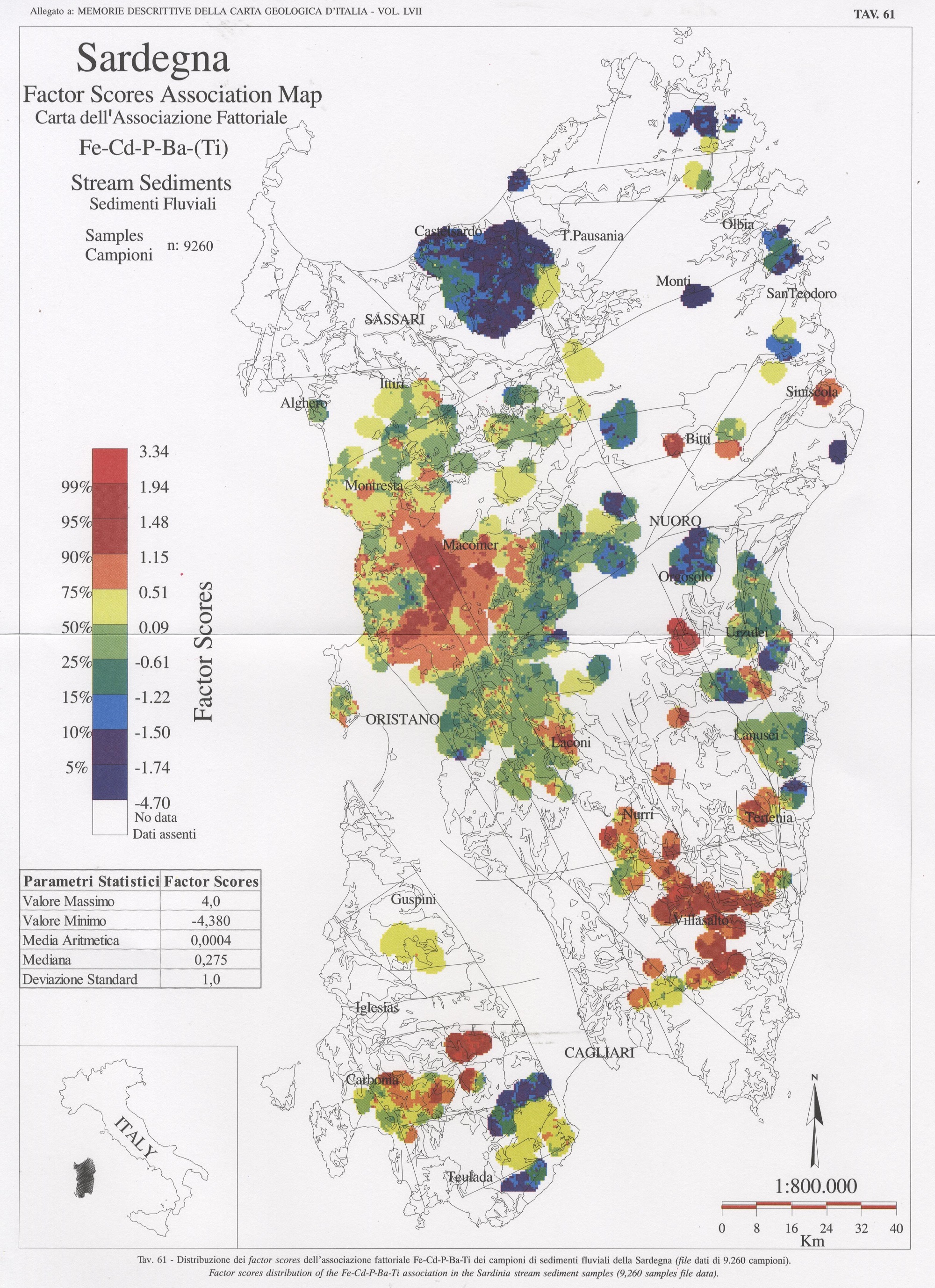 Tav. 61 - Distribuzione dei factor scores dell'associazione fattoriale Fe-Cd-P-Ba-Ti dei campioni di sedimenti fluviali della Sardegna (file dati di 9.260 campioni)
