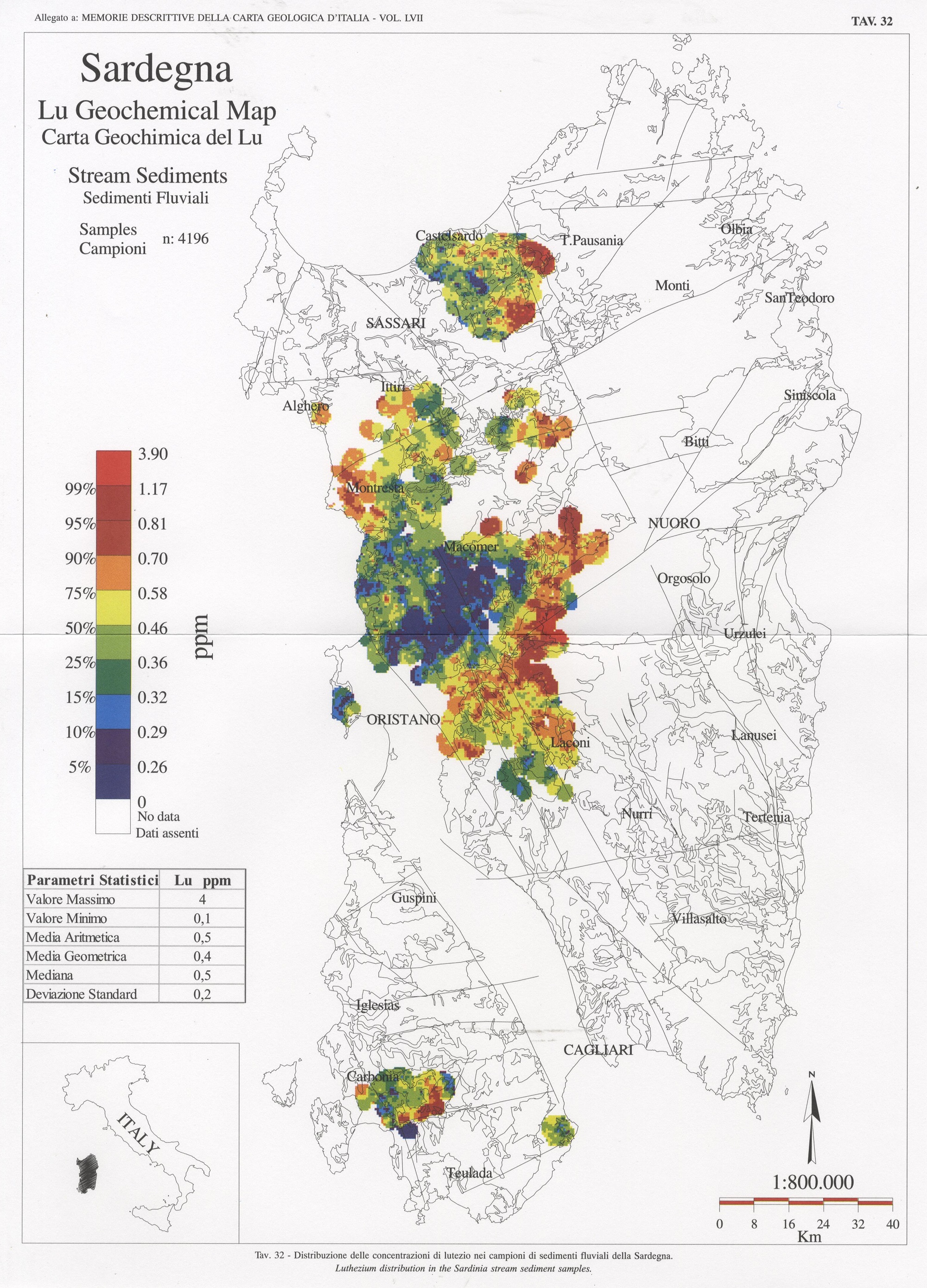 Tav. 32 - Distribuzione delle concentrazioni di lutezio nei campioni di sedimenti fluviali della Sardegna