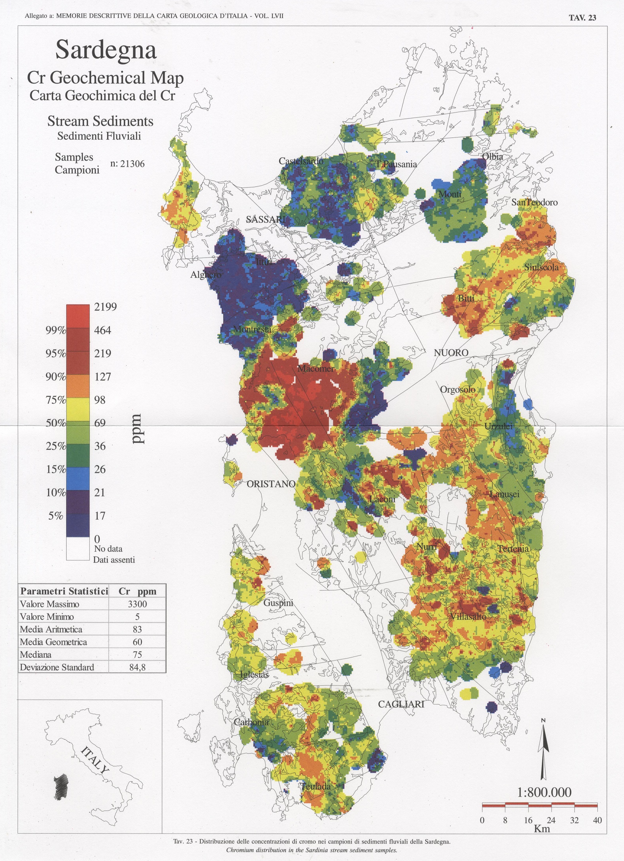Tav. 23 - Distribuzione delle concentrazioni di cromo nei campioni di sedimenti fluviali della Sardegna