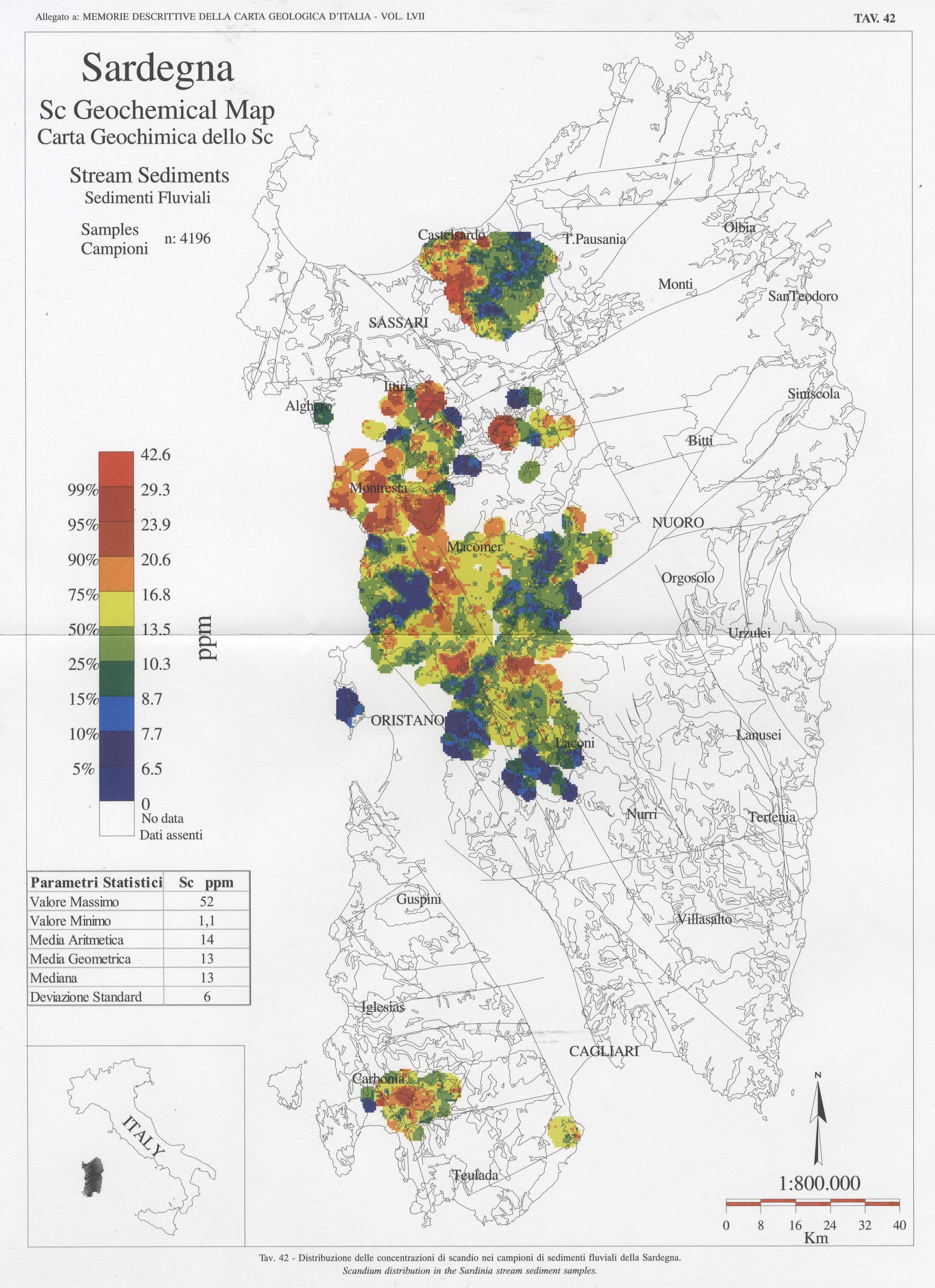 Tav. 42 - Distribuzione delle concentrazioni di scandio nei campioni di sedimenti fluviali della Sardegna