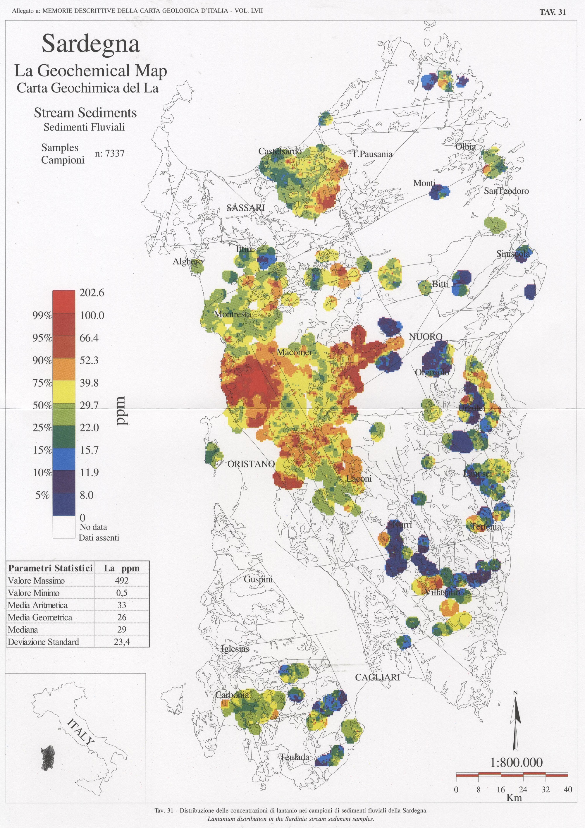 Tav. 31 - Distribuzione delle concentrazioni di lantanio nei campioni di sedimenti fluviali della Sardegna