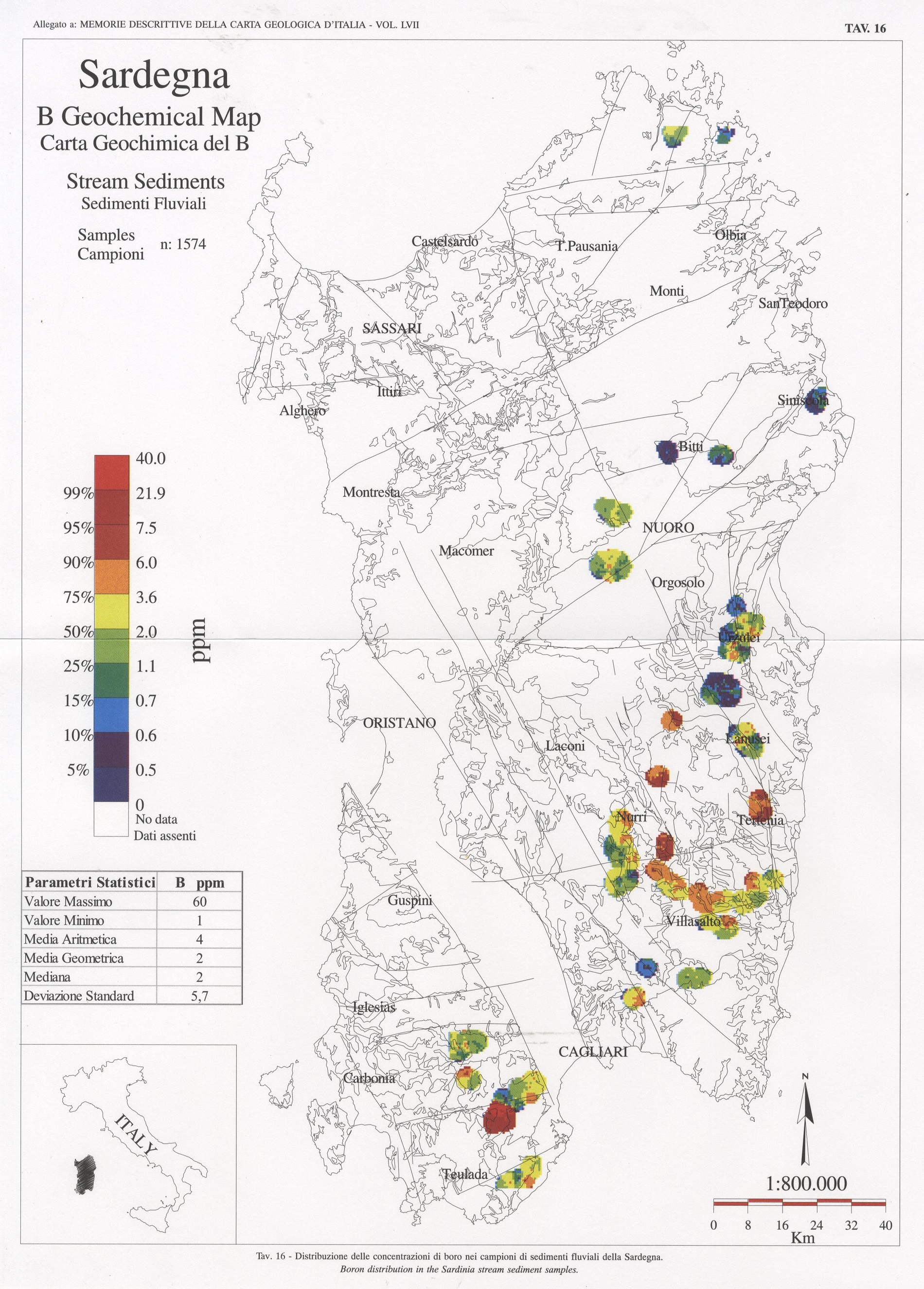 Tav. 16 - Distribuzione delle concentrazioni di boro nei campioni di sedimenti fluviali della Sardegna