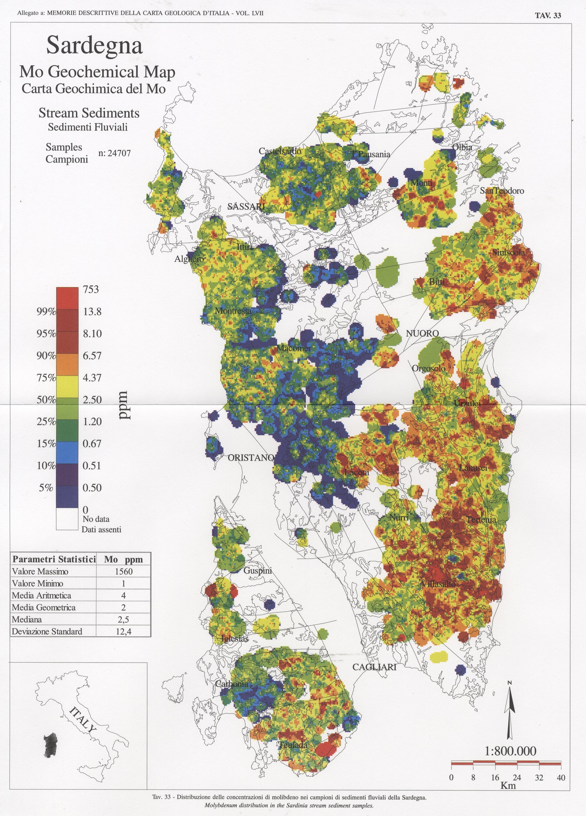 Tav. 33 - Distribuzione delle concentrazioni di molibdeno nei campioni di sedimenti fluviali della Sardegna