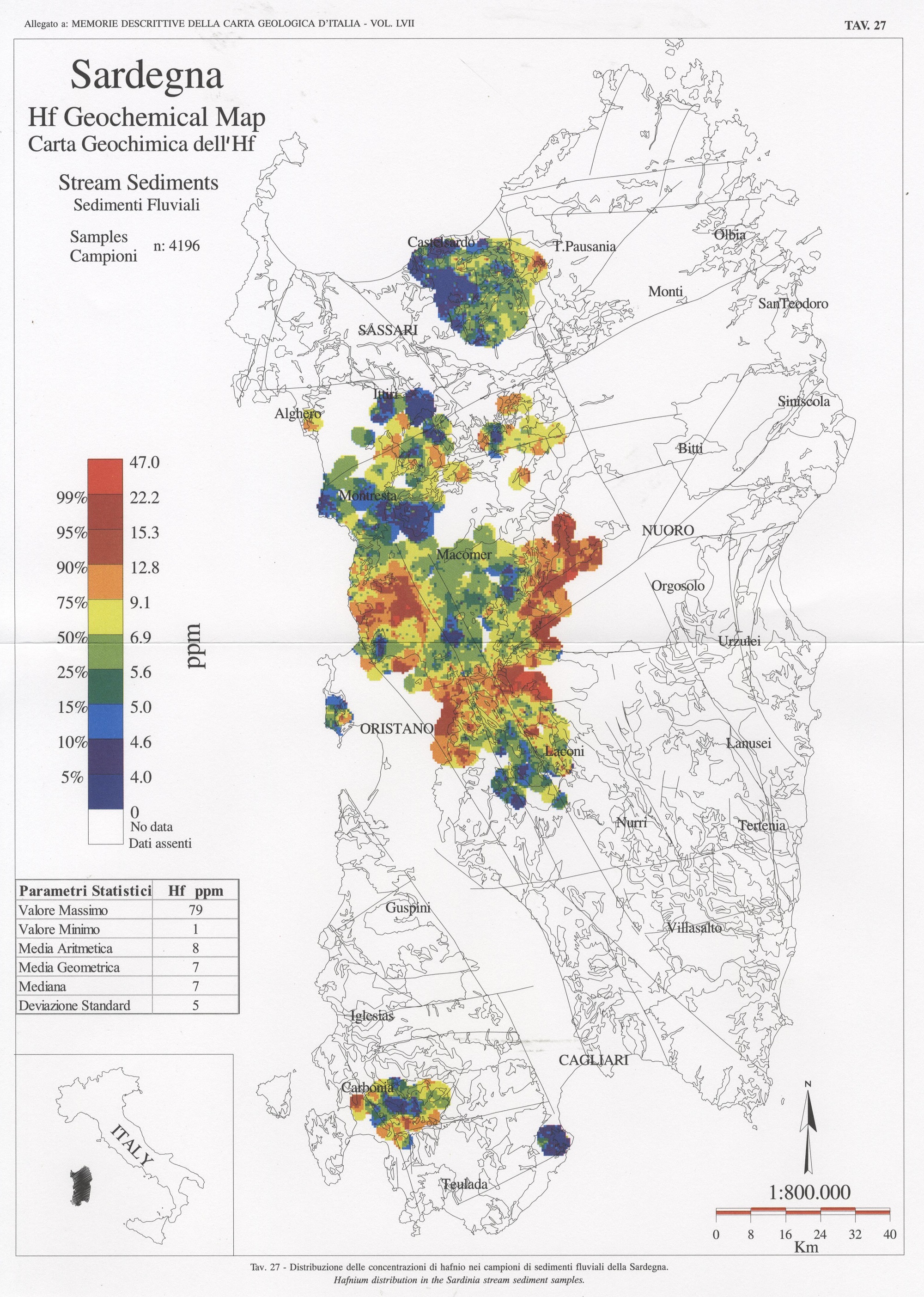 Tav. 27 - Distribuzione delle concentrazioni di hafnio nei campioni di sedimenti fluviali della Sardegna