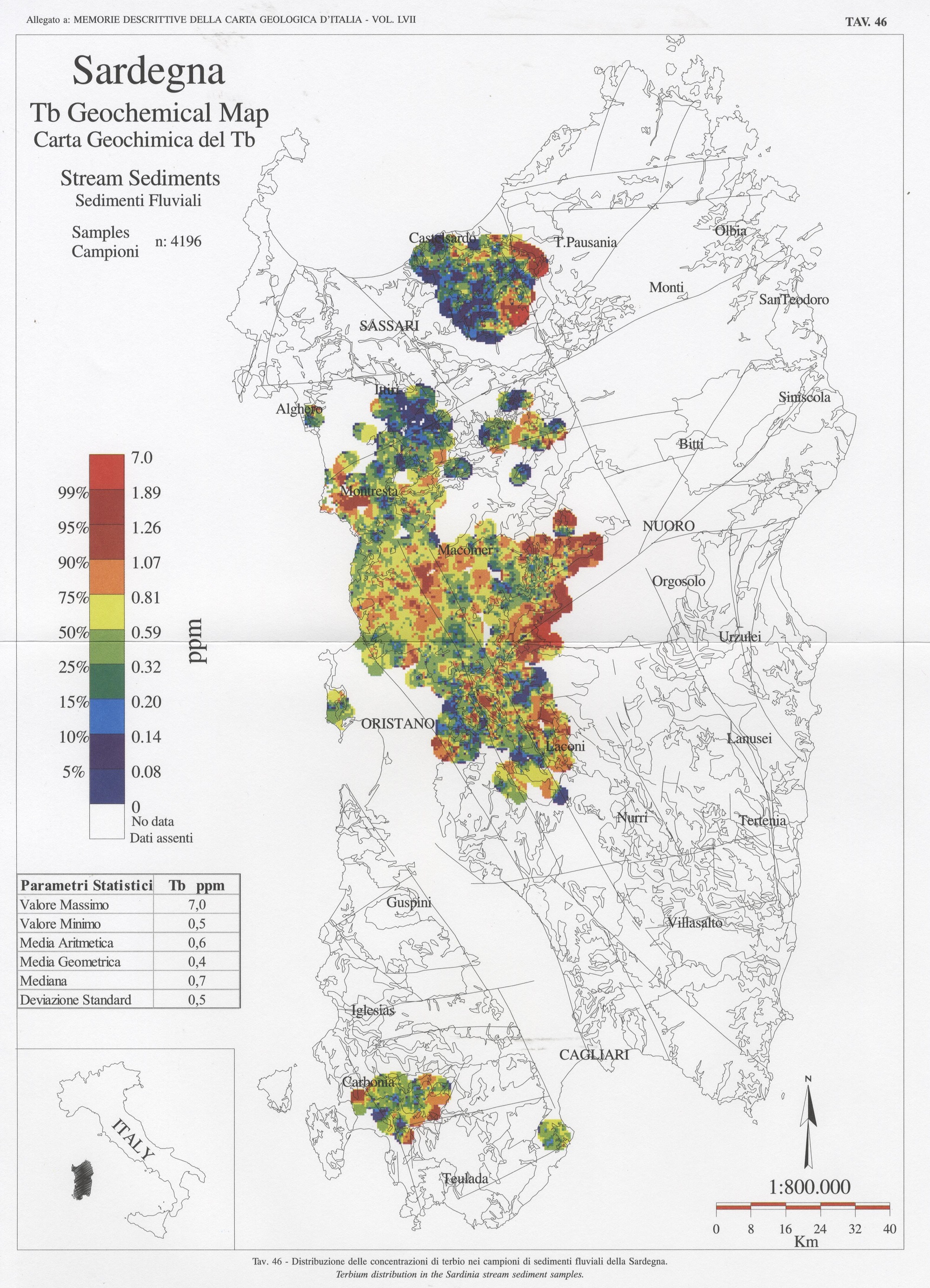 Tav. 46 - Distribuzione delle concentrazioni di terbio nei campioni di sedimenti fluviali della Sardegna