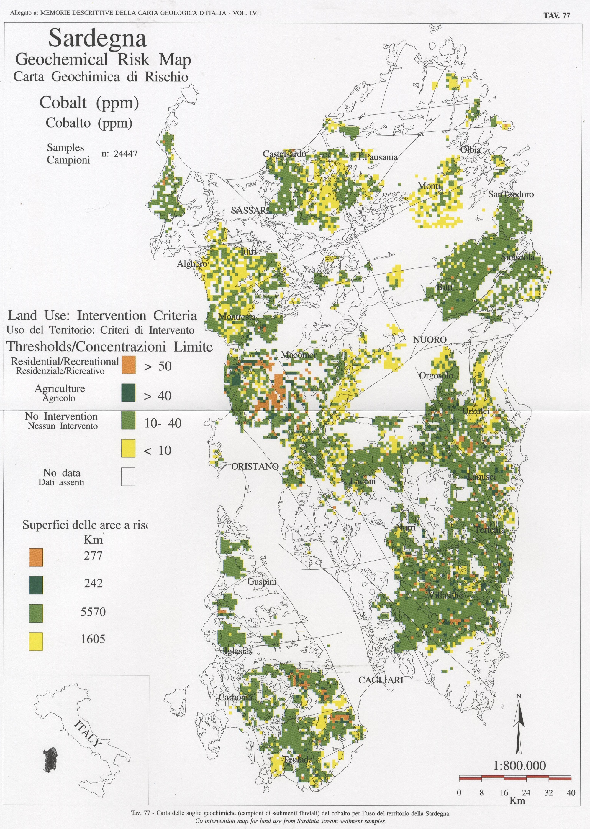 Tav. 77 - Carta delle soglie geochimiche (campioni di sedimenti fluviali) del cobalto per l'uso del territorio della Sardegna