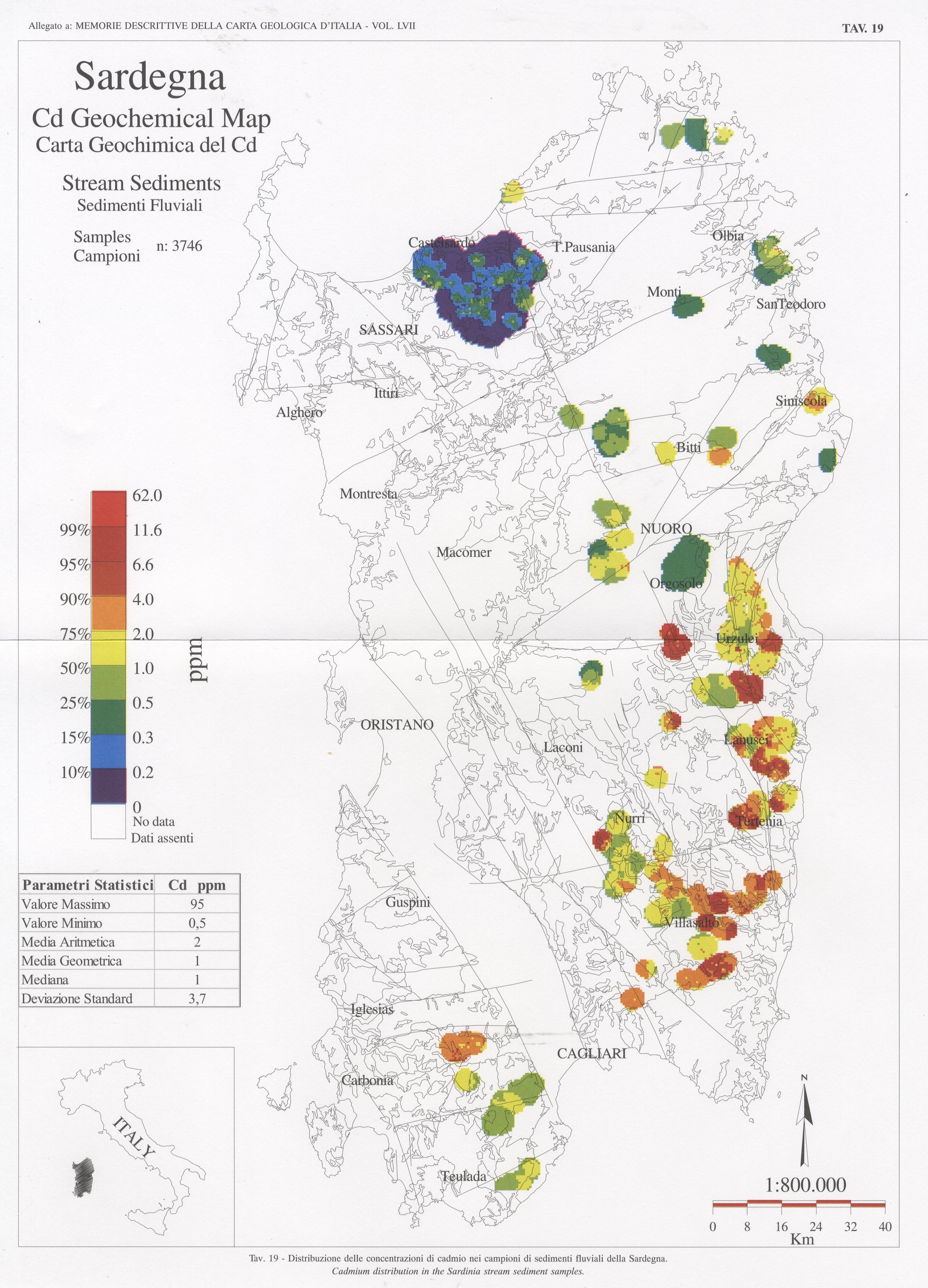 Tav. 19 - Distribuzione delle concentrazioni di cadmio nei campioni di sedimenti fluviali della Sardegna