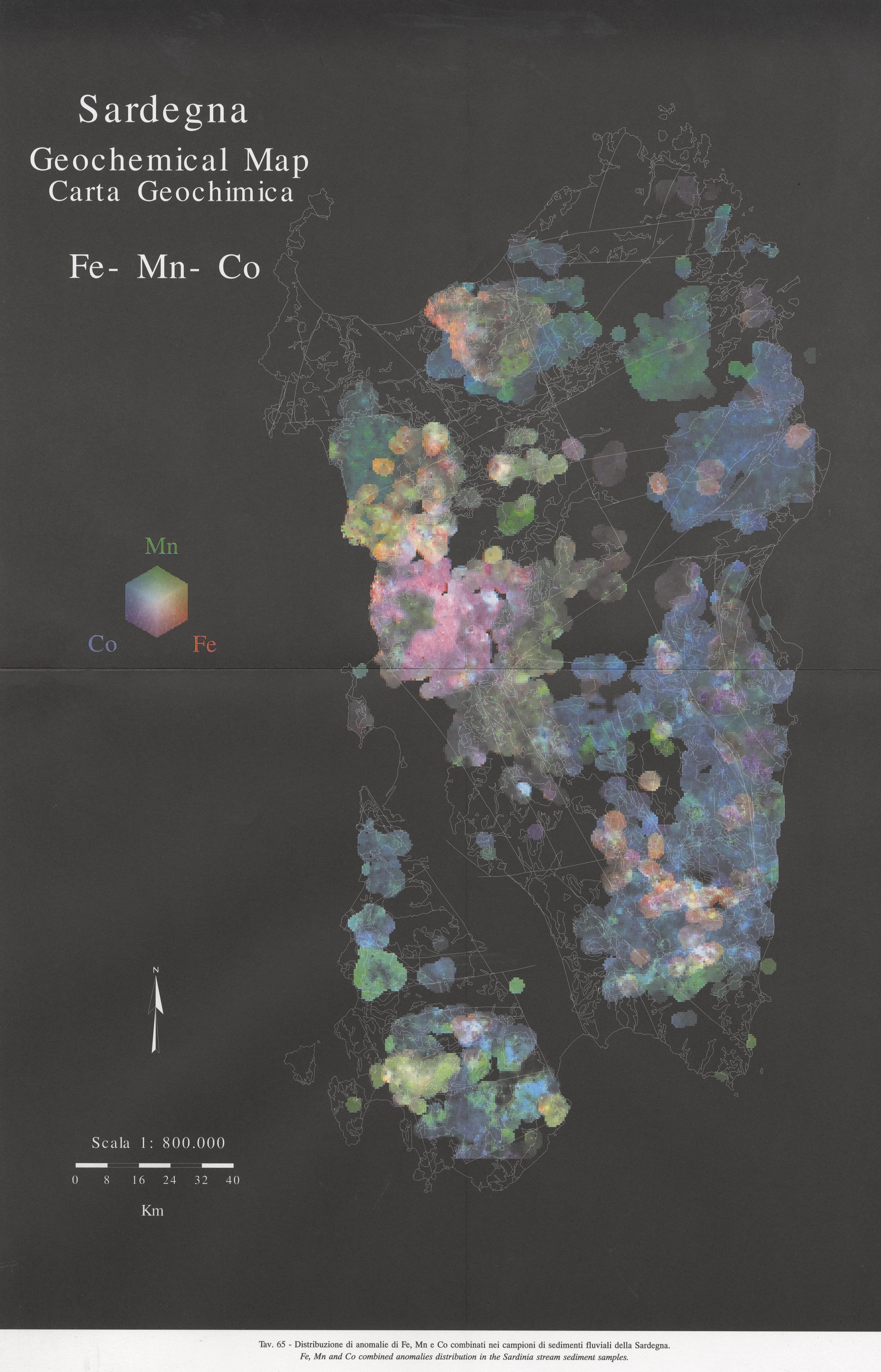 Tav. 65 - Distribuzione di anomalie di Fe, Mn e Co combinati nei campioni di sedimenti fluviali della Sardegna