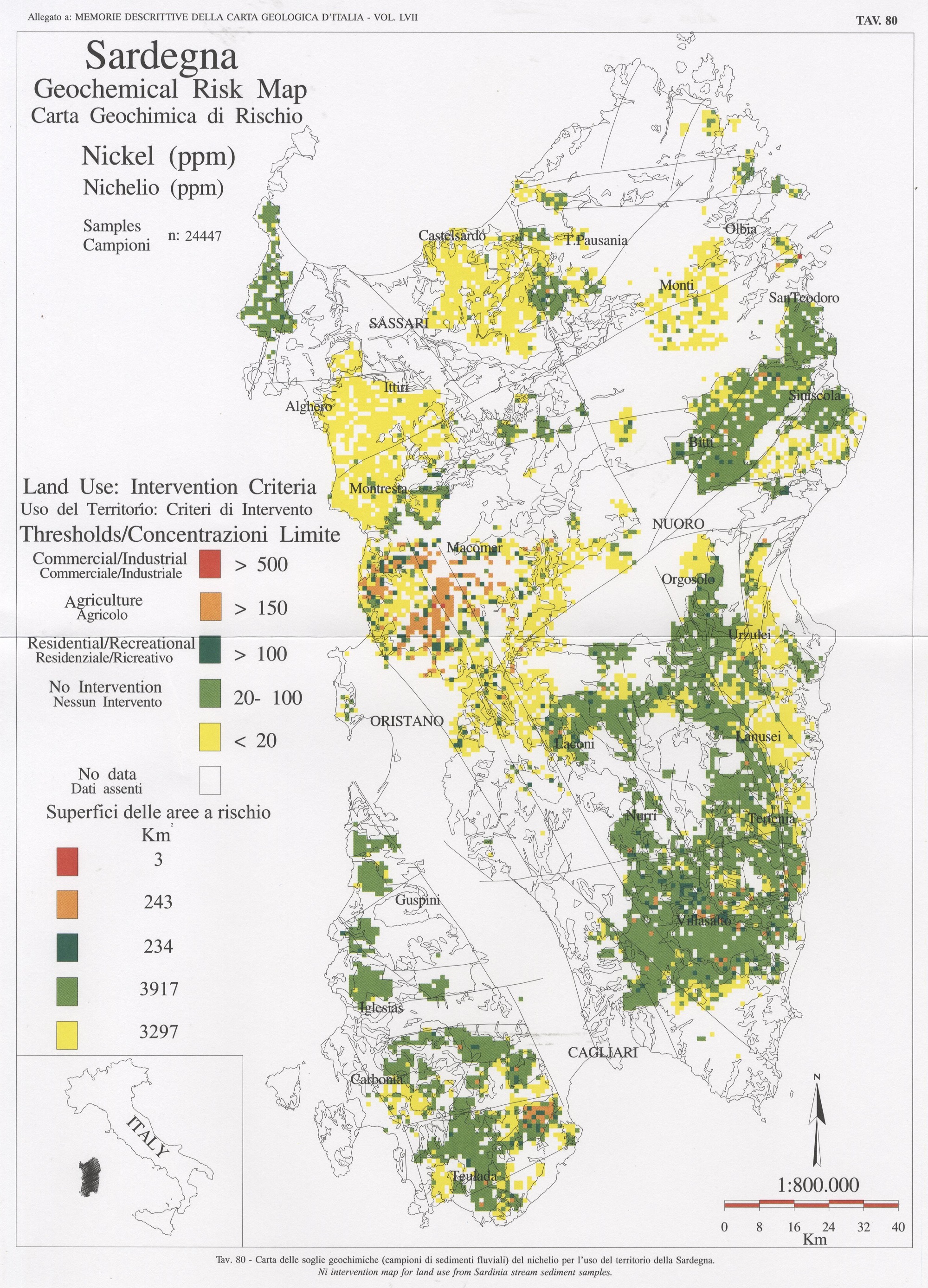 Tab. 80 - Carta delle soglie geochimiche (campioni di sedimenti fluviali) del nichelio per l'uso del territorio della Sardegna