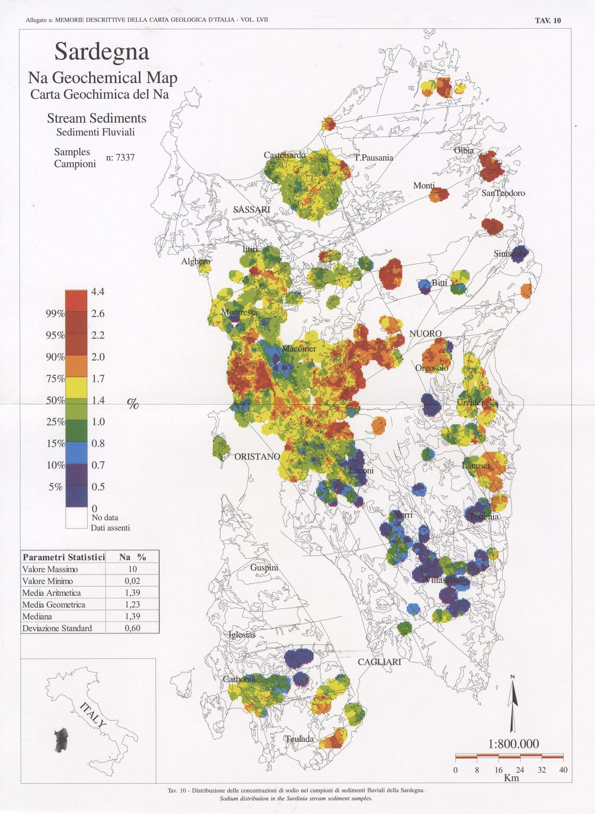 Tav. 10 - Distribuzione delle concentrazioni di sodio nei campioni di sedimenti fluviali della Sardegna