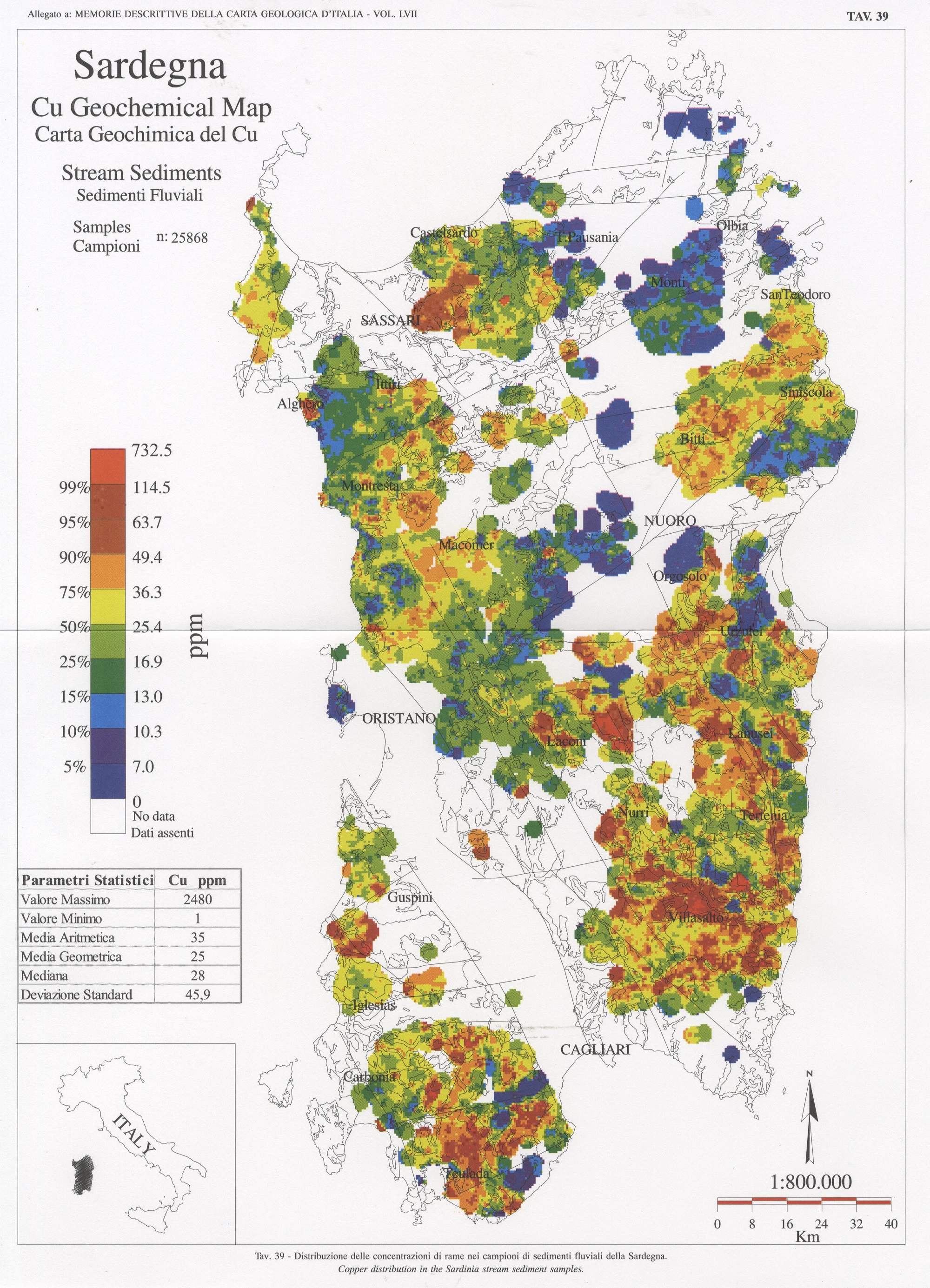 Tav. 39 - Distribuzione delle concentrazioni di rame nei campioni di sedimenti fluviali della Sardegna
