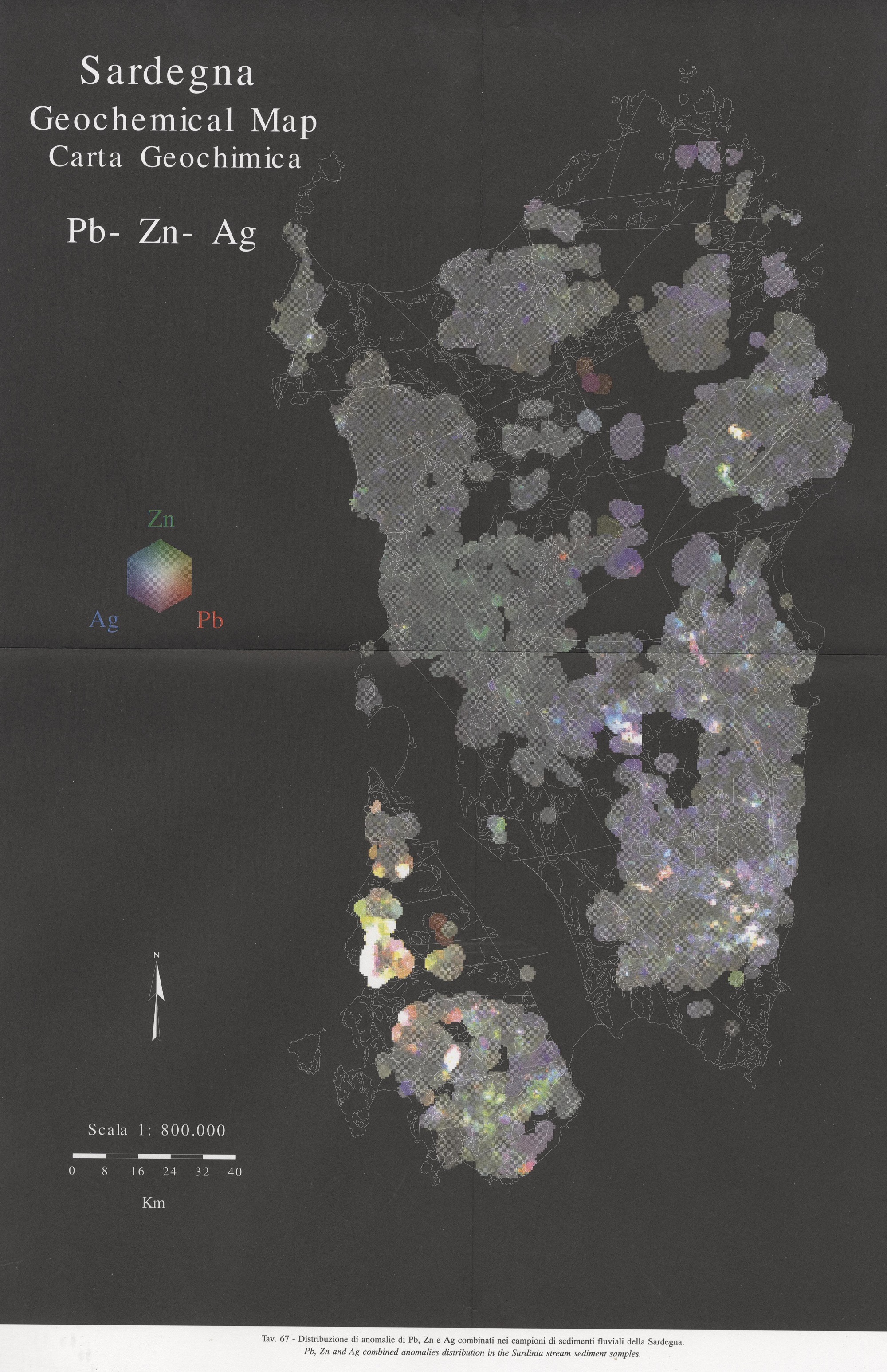 Tav. 67 - Distribuzione di anomalie di Pb, Zn e Ag combinati nei campioni di sedimenti fluviali della Sardegna