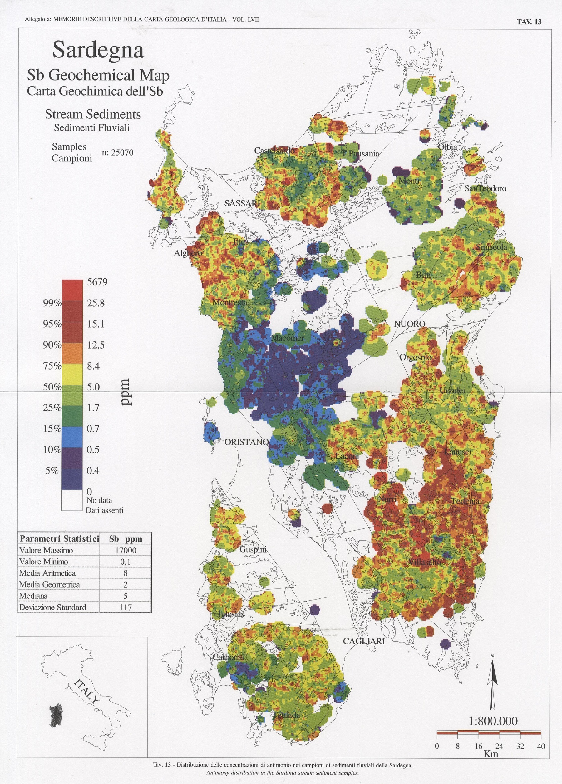 Tav. 13 - Distribuzione delle concentrazioni di antimonio nei campioni di sedimenti fluviali della Sardegna