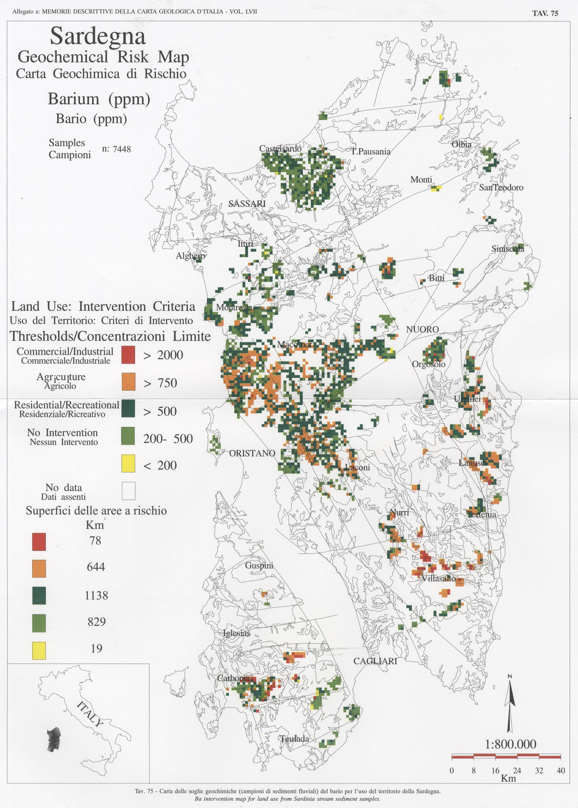 Tav. 75 - Carta delle soglie geochimiche (campioni di sedimenti fluviali) del bario per l'uso del territorio della Sardegna