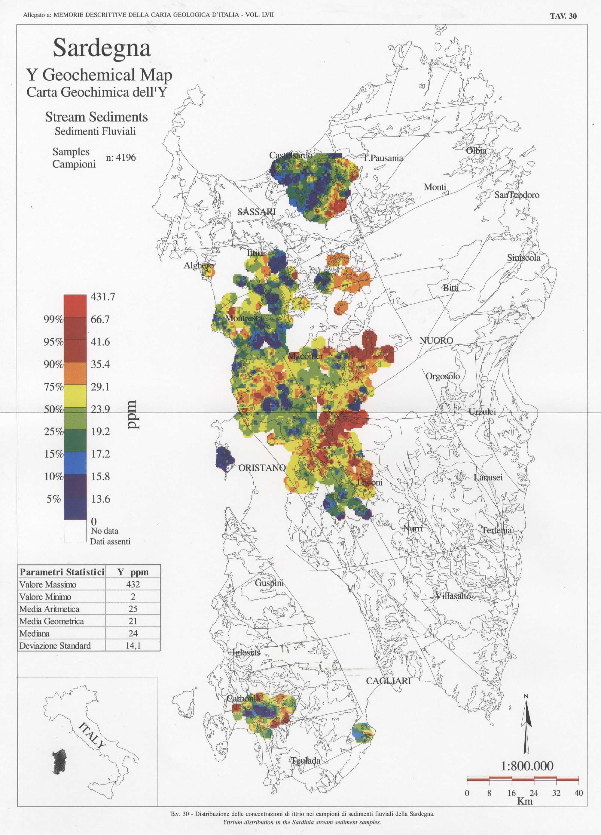 Tav. 30 - Distribuzione delle concentrazioni di ittrio nei campioni di sedimenti fluviali della Sardegna