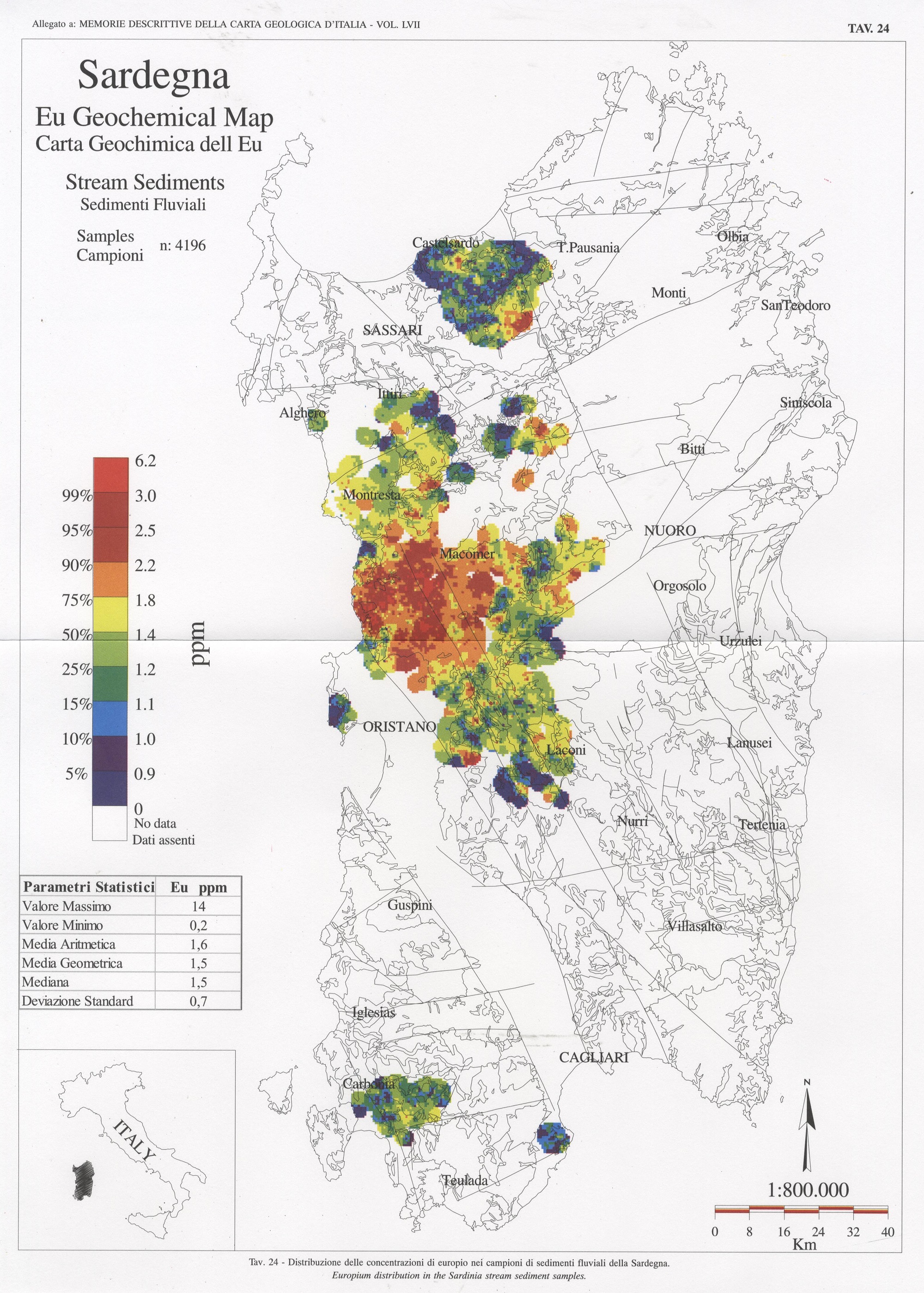 Tav. 24 - Distribuzione delle concentrazioni di europio nei campioni di sedimenti fluviali della Sardegna