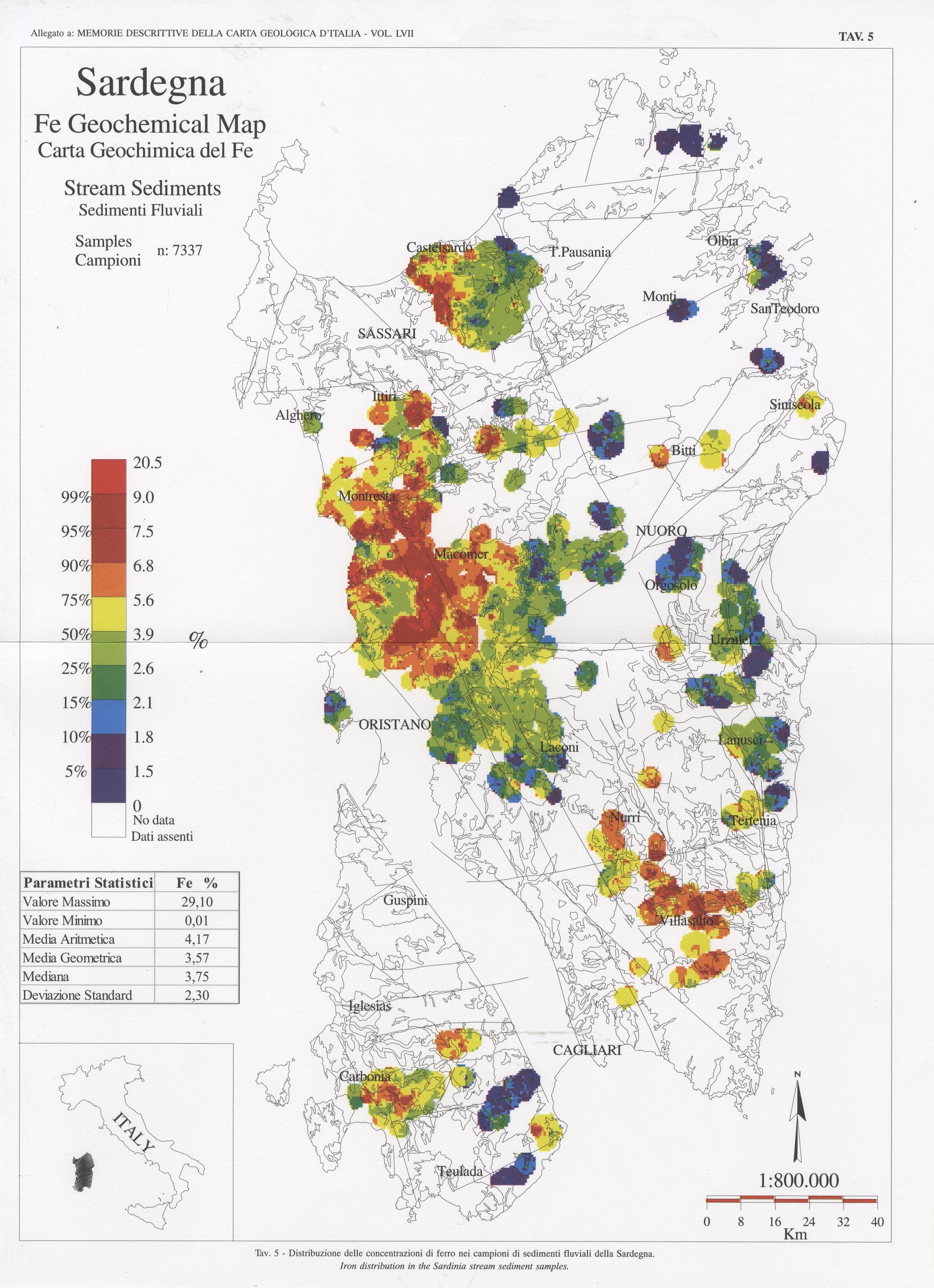 Tav. 5 - Distribuzione delle concentrazioni di ferro nei campioni di sedimenti fluviali della Sardegna
