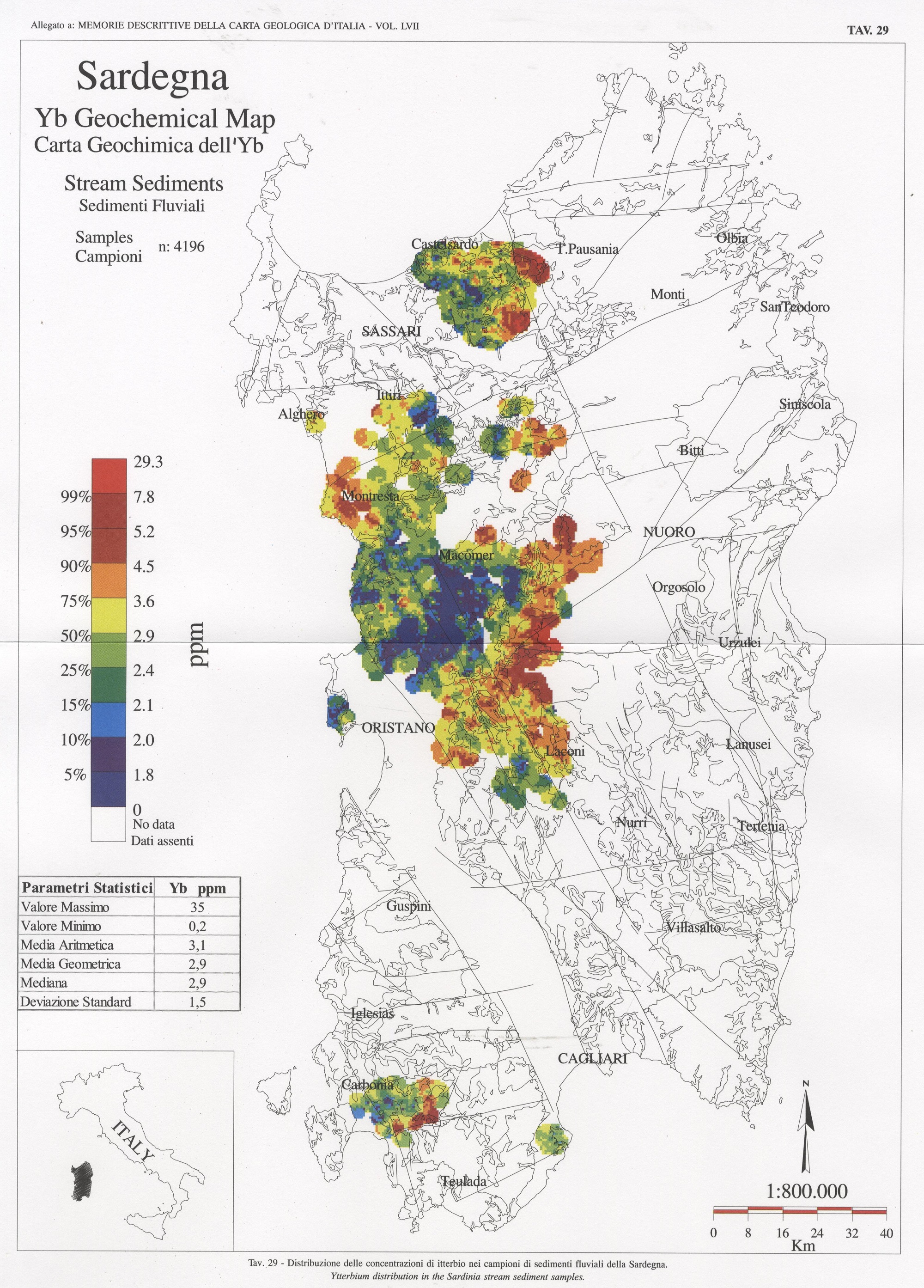 Tav. 29 - Distribuzione delle concentrazioni di itterbio nei campioni di sedimenti fluviali della Sardegna