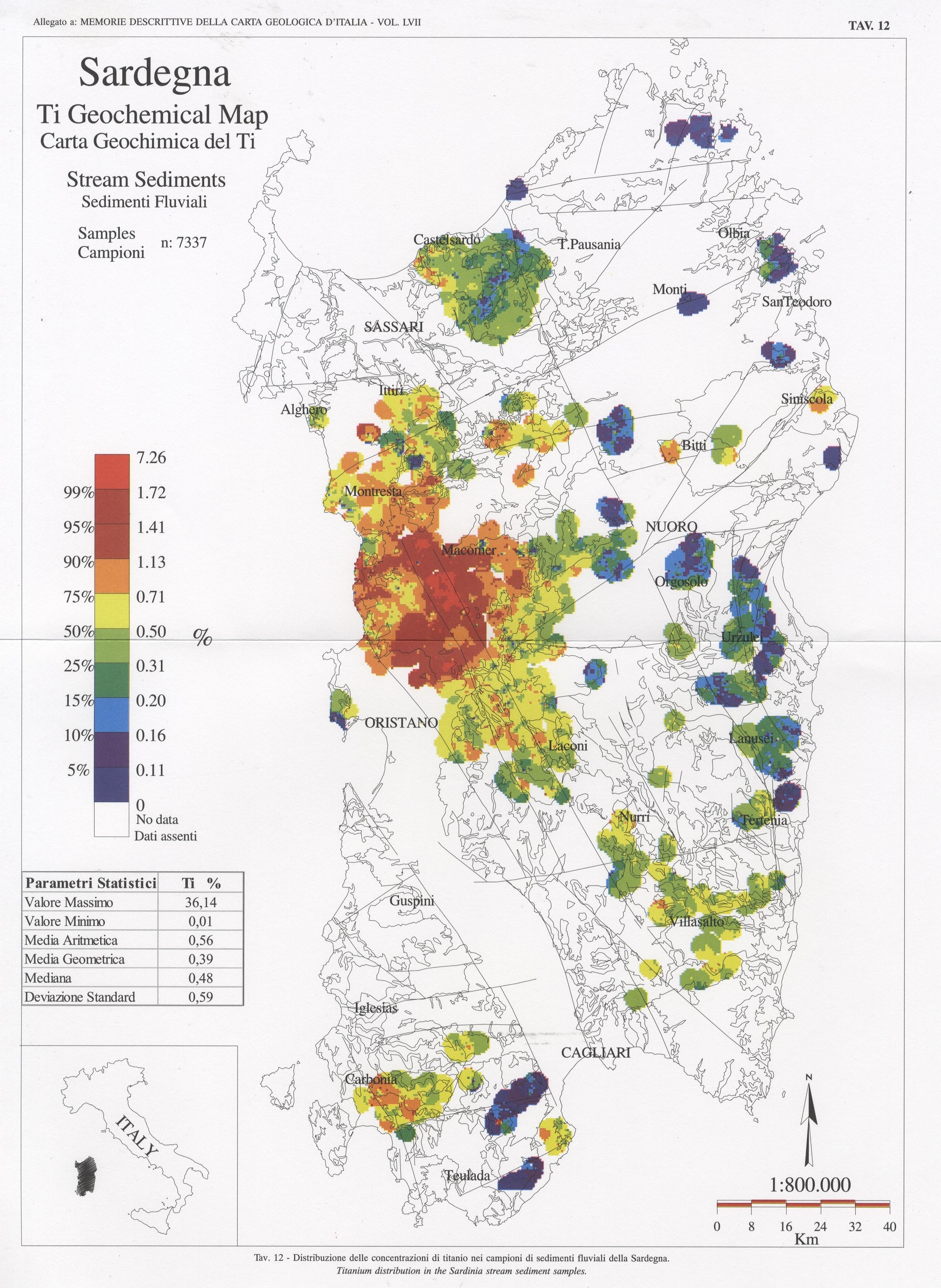 Tav. 12 - Distribuzione delle concentrazioni di titanio nei campioni di sedimenti fluviali della Sardegna